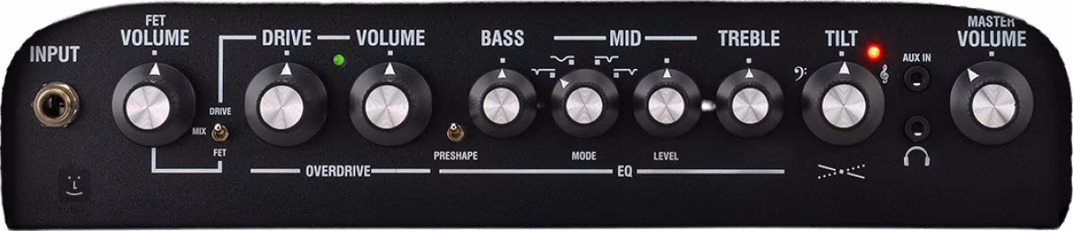 Das Herzstück des Verstärkers sind zwei Kanäle: ein reiner FET-Kanal und ein voll ausgestatteter OVERDRIVE-Kanal mit separaten Lautstärke- und Overdrive-Reglern. Mit der MIX-Position des Kanalschalters können Sie beide Kanäle miteinander verbinden und so den klaren Klang des FET-Kanals mit der Wärme und Artikulation des OVERDRIVE-Kanals bereichern. Ein dreifachbandiger Equalizer mit umschaltbarer Mittenfrequenz, ein PRE-SHAPE-Schalter (Mittenabsenkung, Bass- und Höhenanhebung) und ein TILT-Regler ermöglichen es Ihnen, die Klangfarbe und die Ansprache des Verstärkers detailliert einzustellen, um das gewünschte Ergebnis zu erzielen.