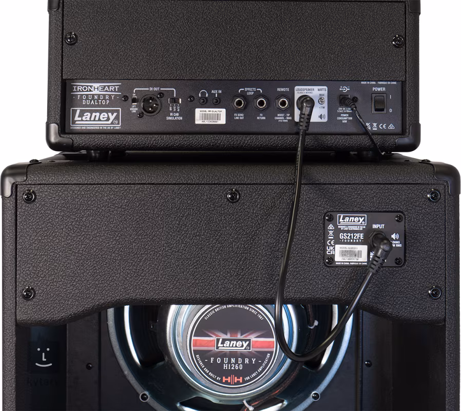 Ebenso wichtig ist die GS212FE-Lautsprecherbox, die speziell für die perfekte Ergänzung des IRF-DUALTOP-Heads entwickelt wurde. Sie bietet Ihnen 120 Watt RMS-Leistung und bis zu 480 Watt Spitzenleistung. Im Inneren befinden sich zwei 12-Zoll-Lautsprecher H1260. Die Box hat eine Holzkonstruktion und ein sogenanntes "Open-Back-Design" oder eine offene Rückwand. Sie ist durch schwarze Metallecken geschützt. Zum Lieferumfang gehört auch ein Kabel für die einfache Verbindung zwischen dem Verstärker und der Lautsprecherbox.