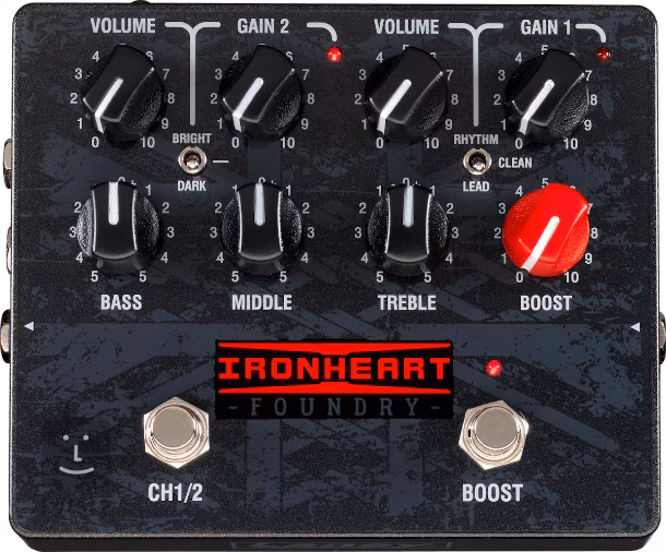 Der IRF-LOUDPEDAL bietet eine Leistung von 60 Watt und zwei per Fußschalter umschaltbare Kanäle mit einer breiten Klangpalette, die von kristallklarem Signal bis hin zu rockiger Verzerrung reicht. Jeder Kanal verfügt über einen eigenen Modus-Schalter. Der Schalter für Kanal 1 (CH1) hat die Modi Clean/Rhythm/Lead und deckt damit das Spektrum von klaren Signalen mit geringer Kompression bis hin zu aggressiven verzerrten Tönen ab. Der Schalter für Kanal 2 (CH2) verfügt über drei EQ-Voicings – mit Bright betonen Sie die Höhen, Flat bietet Ihnen eine lineare Ansprache und Dark unterstreicht die Bassfrequenzen. Die einzelnen Frequenzen können Sie dann mit Hilfe eines dreistufigen Equalizers, der für beide Kanäle gemeinsam ist, feinabstimmen. Der zweite Fußschalter, der sogenannte Boost, dient zur Verstärkung des Signals und verleiht Ihrem Sound den nötigen Glanz und Drive.