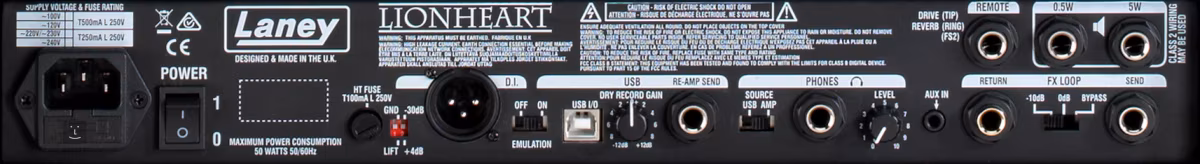 Die Rückseite bietet einen Eingang und Ausgang für die Effektschleife, einen XLR-DI-Ausgang mit einstellbarer 4x-12-Lautsprecherbox-Emulation, eine USB-Schnittstelle, einen Klinkenausgang für Re-Amping, einen Kopfhörerausgang, einen Aux-In-Eingang für Audio-/MP3-Geräte und einen Anschluss für den Laney FS2-Fußschalter, der im Lieferumfang enthalten ist.