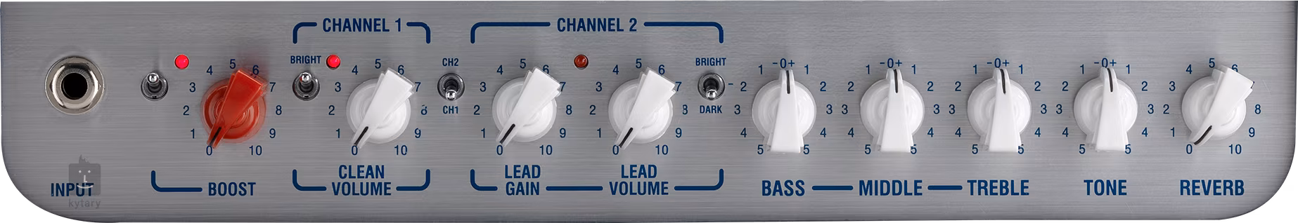 • Regler Boost, Clean Volume, Lead Gain, Lead Volume, Bass, Middle, Treble, Tone, Reverb, Switches: Boost, Bright, CH1/2, Bright/Natural/Dark