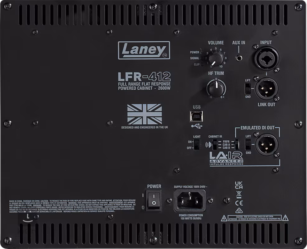 Auf der Rückseite befinden sich ein kombinierter XLR/Klinken-Eingang (6,3 mm) mit Lautstärkeregler und LED-Clipping-Anzeige, ein Hochfrequenztreiber (HF Trim) zur Anpassung der Box an die Umgebung und ein Line-XLR-Ausgang mit schaltbarer Masse, USB-B-Schnittstelle für den Zugriff auf LFR-412 IR-Presets und Cab EQ (herunterladbar von der LA∙IR LFR-App), symmetrischer XLR-DI-Ausgang mit umschaltbarer Cab-IR (FRFR, Cab A, Cab B), Aux-In-Eingang für externe Audioquellen und schaltbare LED-Hintergrundbeleuchtung auf der Frontplatte.