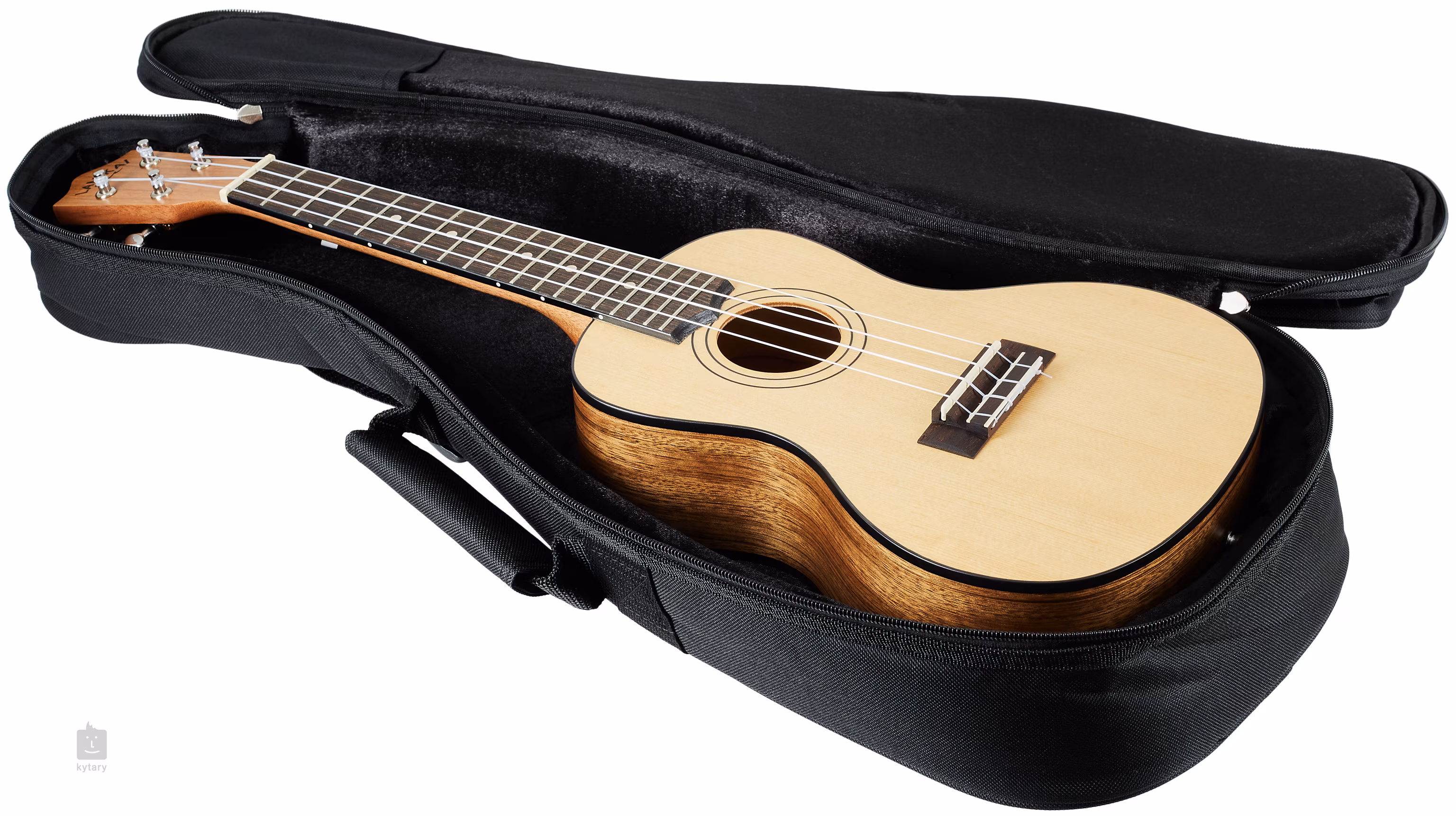 Das schlichte, aber stilvolle Design wird durch das schwarze Binding, die aus zwei schwarzen Ringen bestehende Rosette und das satinierte Finish unterstrichen. Die Ukulele wird in einem Gigbag mit 20 mm dicker Polsterung geliefert.