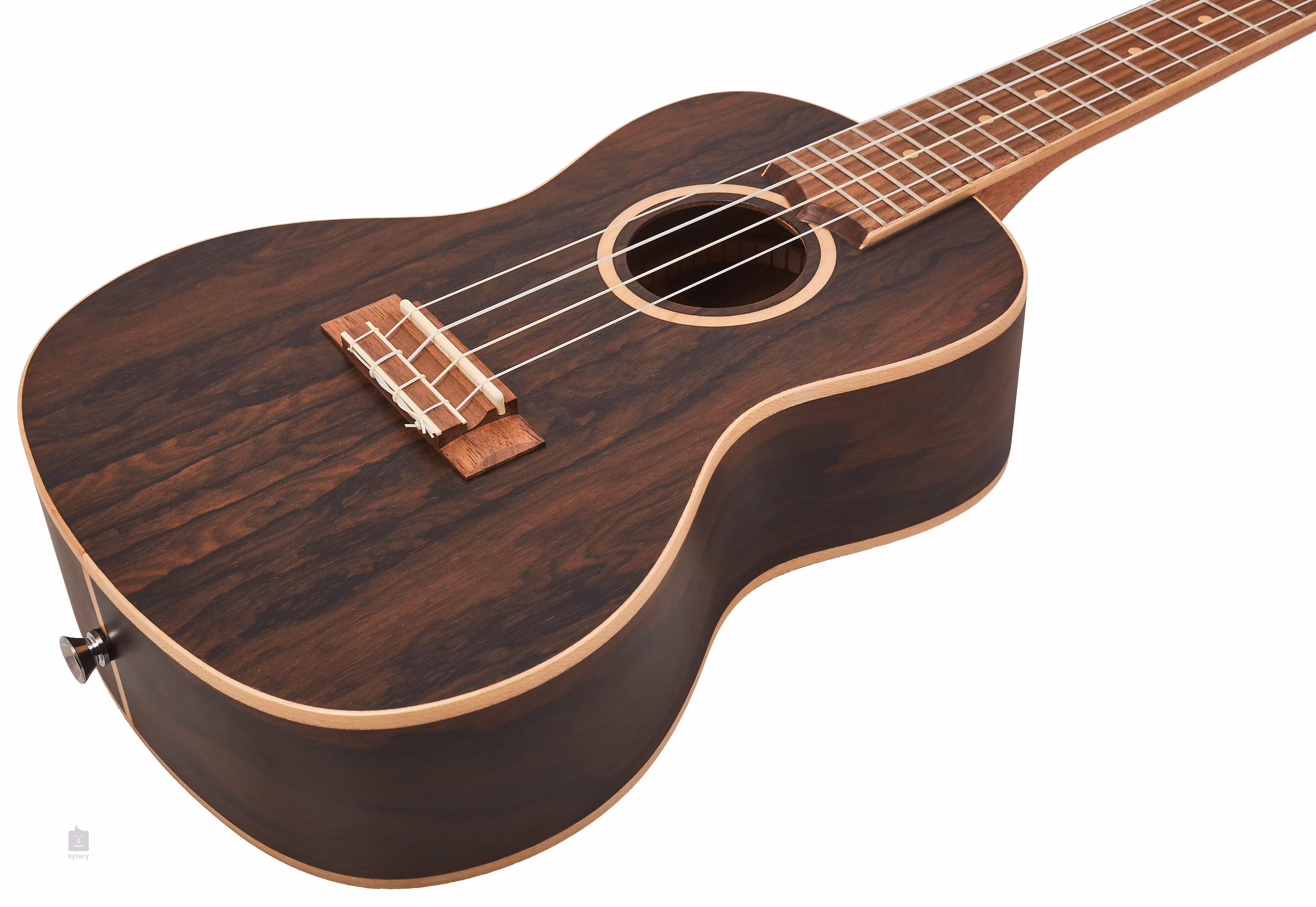 Der Korpus dieser Konzert-Ukulele ist aus überlagerndem Ziricote-Holz gefertigt, das dem Instrument neben seiner beeindruckenden Optik einen warmen, dunkleren Ton verleiht. Das Griffbrett aus Walnussholz ist mit achtzehn Bünden ausgestattet, wobei Positionsmarkierungen für eine einfache Orientierung sorgen. Der breitere Hals des Instruments und der Nullbund bieten ein angenehmes Griffbrettgefühl und eine gute Beweglichkeit, während der NuBone XB-Sattel und der Nullbund für ein gutes Saitensustain sorgen. Die Stimmstabilität wird durch die hochwertige, offen verchromte Mechanik gewährleistet. Der optische Eindruck wird durch die Ahornrosette und das Binding (Korpus und Griffbrett) akzentuiert, die einen schönen Kontrast zur Farbe des Ziricote-Holzes bilden. Die Ukulele wird mit einem Gigbag mit 10 mm dicker Polsterung geliefert.