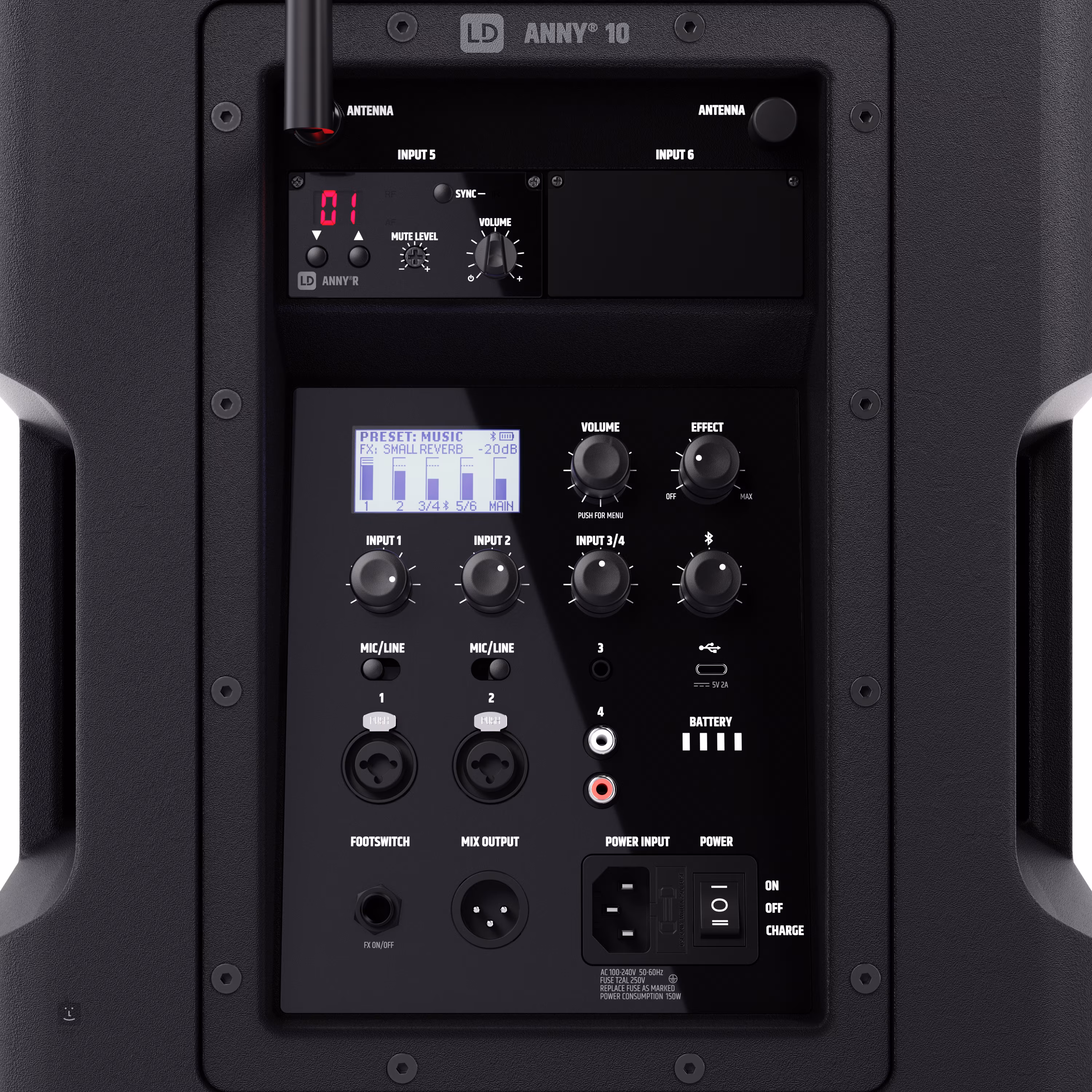 Langlebig Dank der energiesparenden ECO-Voreinstellung kann der ANNY bei mittlerer Lautstärke und bei Verwendung von zwei Batterien bis zu 25 Stunden lang betrieben werden. Sie können den Akku in 3,5 Stunden wieder auf 80 % aufladen. Dank des USB-C-Anschlusses auf der Rückseite können Sie auch Ihr Mobiltelefon oder Tablet aufladen.