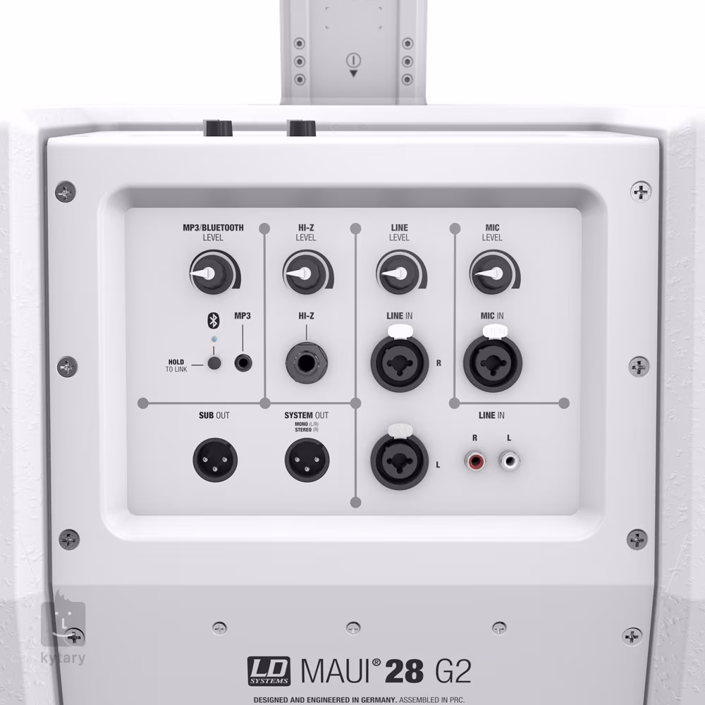 Das MAUI 11 G2 ist ein vielseitiges, kompaktes PA-System mit Bluetooth und integriertem Vier-Kanal-Mixer. Die DynX DSP-Technologie und die Lautsprecheranordnung ermöglichen eine größere Reichweite im Raum und sorgen für eine gleichbleibende Hörqualität sowohl für die erste Reihe als auch für weiter entfernte Zuhörer. Der Class-D-Verstärker ist mit einer Vielzahl von Schutzschaltungen (Limiter, Thermal, Short) für einen reibungslosen Systembetrieb ausgestattet. Zusätzlich zu den Standard-Stereo-Eingängen (Line In, RCA) verfügt das Hauptpanel über Mikrofon-, Instrumenten- und MP3-Eingänge, jeweils mit einem separaten Lautstärkeregler. Um sich mit einem Bluetooth-Gerät zu synchronisieren, halten Sie einfach den Controller. Eine schnelle und bequeme Verbindung zwischen Satelliten und Subwoofer wird durch ein kabelfreies Säulensystem ermöglicht.