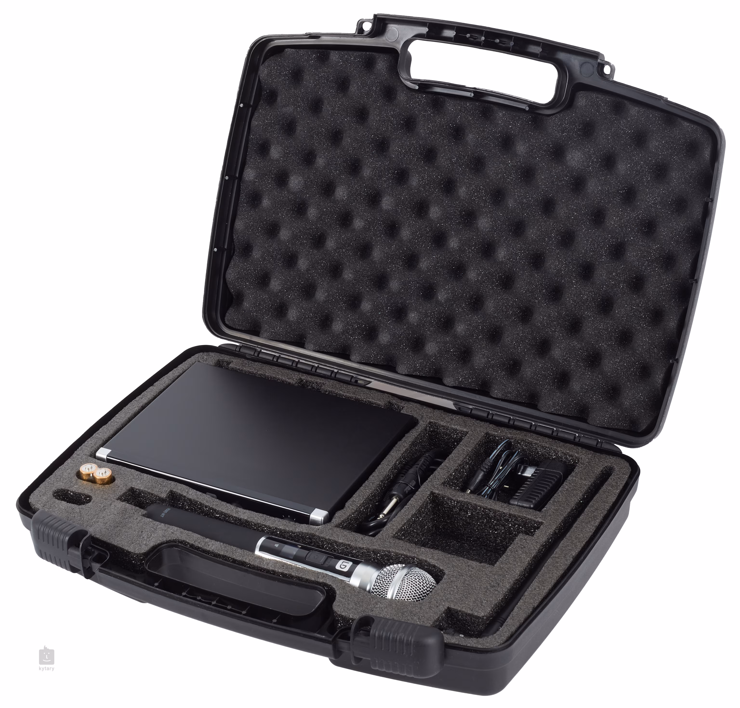 Der Mikrofonsender hat austauschbare Mikrofoneinsätze. Dieses Modell ist mit einem dynamischen Einsatz mit Nierencharakteristik ausgestattet. Mit zwei AA-Batterien kann es bis zu 10 Stunden lang betrieben werden.