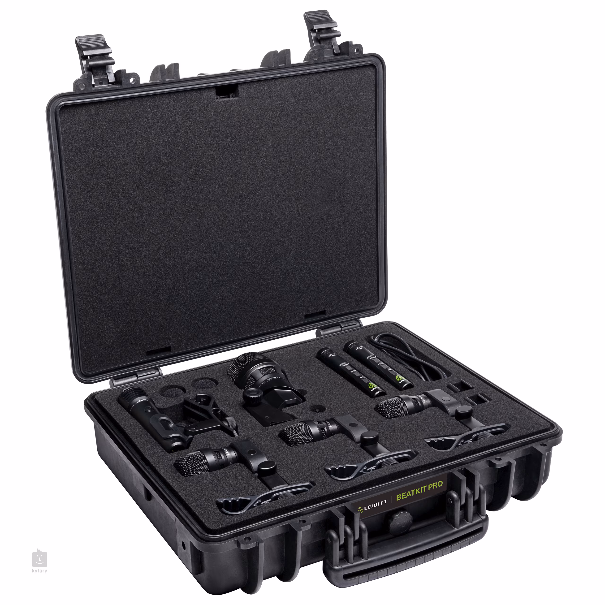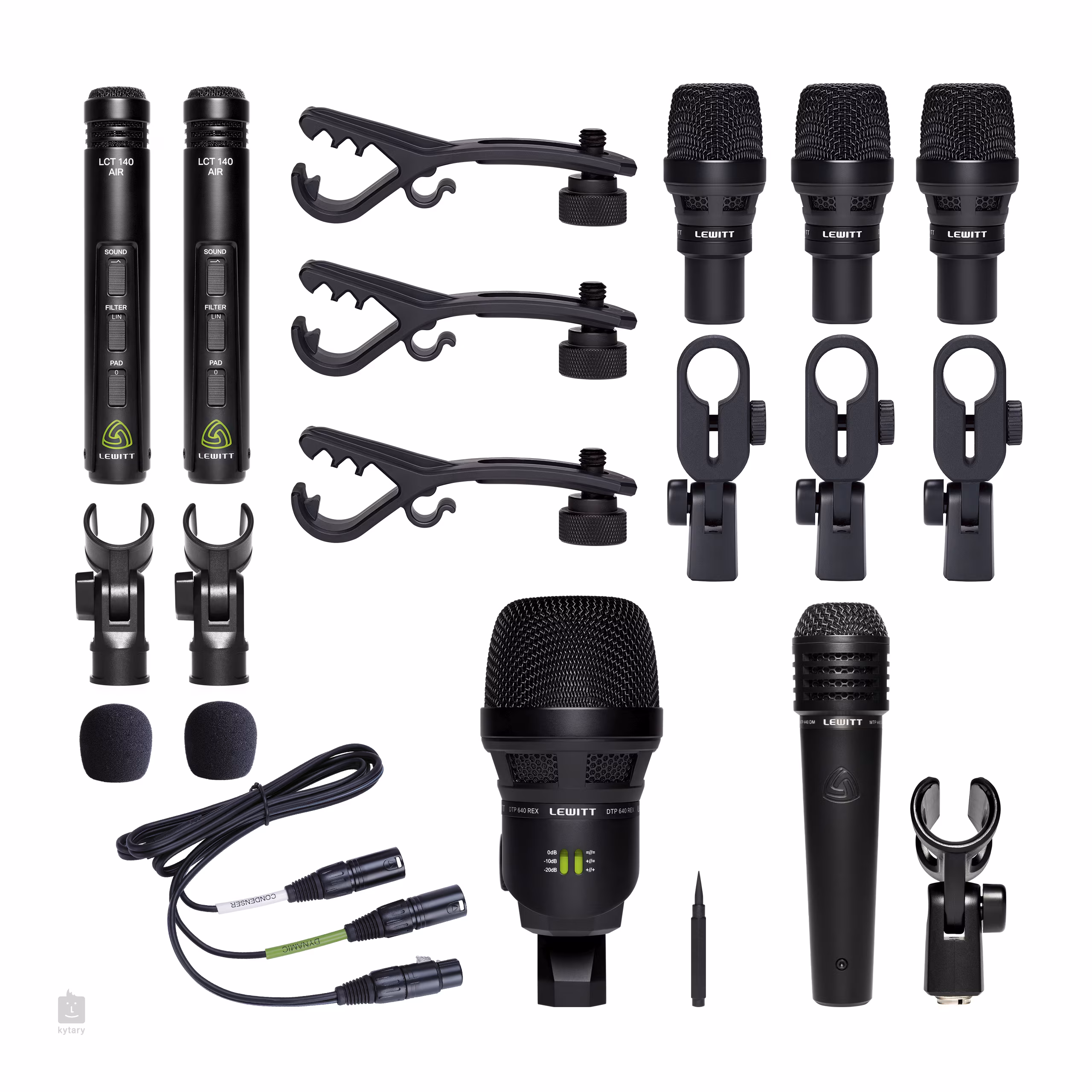 Das Lewitt BEATKIT PRO Set mit sieben Mikrofonen eignet sich für die Beschallung eines Schlagzeugs im Tonstudio oder bei Live-Auftritten. Das Set enthält ein DTP 340 REX für die Bassdrum, ein MTP 440 DM für die Snaredrum, drei DTP 340 TT für die Toms und ein Stereopaar LCT 140 AIR für Overhead-Aufnahmen. Im Lieferumfang enthalten sind außerdem sechs Mikrofonhalterungen, zwei Windschutzhauben für Stabmikrofone, ein 1,5 m langer Kabelsplitter von 5-polig auf 2x 3-polig XLR und ein robuster Koffer für den sicheren Transport. Das Lewitt DTP 340 REX ist ein dynamisches Mikrofon, das sich besonders für die Abnahme der Bassdrum eignet. Es verfügt über einen integrierten Equalizer, mit dem Sie die gewünschten Frequenzen hervorheben und das Mikrofon so an Ihre spezifischen Bedürfnisse anpassen können. Die Nierencharakteristik sorgt für eine maximale Ausrichtung auf die Schallquelle und verhindert die Aufnahme von Umgebungsgeräuschen. Das Mikrofon kommt unter allen Umständen mit hohem Schalldruck zurecht und bietet stets einen massiven, aber dennoch klaren und natürlichen Klang. Damit holen Sie das Maximum aus Ihrer Bassdrum heraus! Das Lewitt MTP 440 DM ist ein dynamisches Mikrofon, das sich besonders für die Aufnahme von Snare-Drums eignet. Seine Membran wurde speziell entwickelt, um den durchdringenden Klang der Snare einzufangen und dem hohen Schalldruck der Trommeln standzuhalten. Dank seiner Nierencharakteristik kann das Mikrofon die Hauptschallquelle isolieren, Umgebungsgeräusche herausfiltern und einen zuverlässigen Schutz vor Rückkopplungen gewährleisten. Das Lewitt DTP 340 TT ist ein dynamisches Mikrofon, das sich besonders für die Aufnahme von Toms eignet. Seine Supernierencharakteristik sorgt für eine klare Ausrichtung auf die Quelle des aufgenommenen Klangs und verhindert die unerwünschte Aufnahme von Geräuschen aus den übrigen Teilen Ihres Schlagzeugs. Es kommt unter allen Umständen mit hohem Schalldruck zurecht und bietet stets einen klaren und natürlichen Klang. Das Mikrofon verfügt über eine sehr robuste Metallkonstruktion, sodass es auch Stürze und unbeabsichtigte Stöße übersteht. Damit ist es der ideale Begleiter im Studio und auf der Bühne. Das Lewitt LCT 140 Air ist ein Kleinmembran-Kondensatormikrofon, das sich ideal für die Aufnahme von Schlaginstrumenten eignet. Das A und O des Mikrofons ist der Air/Flat-Schalter. Im Air-Modus ist das Audiosignal voll und ausgewogen, sodass keine langwierige Nachbearbeitung erforderlich ist. Der Flat-Modus hingegen bietet einen linearen Frequenzgang, sodass das Instrument absolut authentisch und ohne jegliche Verschönerungseffekte aufgenommen wird. Bei Verwendung von zwei Lewitt LCT 140 Air-Mikrofonen ist es das ideale Gerät für Stereoaufnahmen und Overhead-Aufnahmen von Schlagzeugen. Das Mikrofon hat eine Nierencharakteristik, sodass es Umgebungsgeräusche zuverlässig herausfiltert. Wenn Sie auf der Suche nach einer kompletten Ausrüstung für die Aufnahme Ihres Schlagzeugs sind, ist das Lewitt BEATKIT PRO genau das Richtige für Sie!