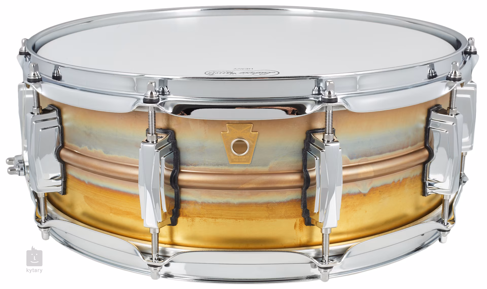 Die Ludwig 14" x 5" Raw Brass LB454R verfügt über einen Korpus aus 1,2 mm dickem, unlackiertem, nahtlosem Messing, dreifach gebogene 2,3 mm dicke Stahlreifen, P88AC Throw Off + P35P Butt Plate Besaitungsmechanik, zehn Kessel (Imperial Lugs) und Ludwig Weather Master Balg.