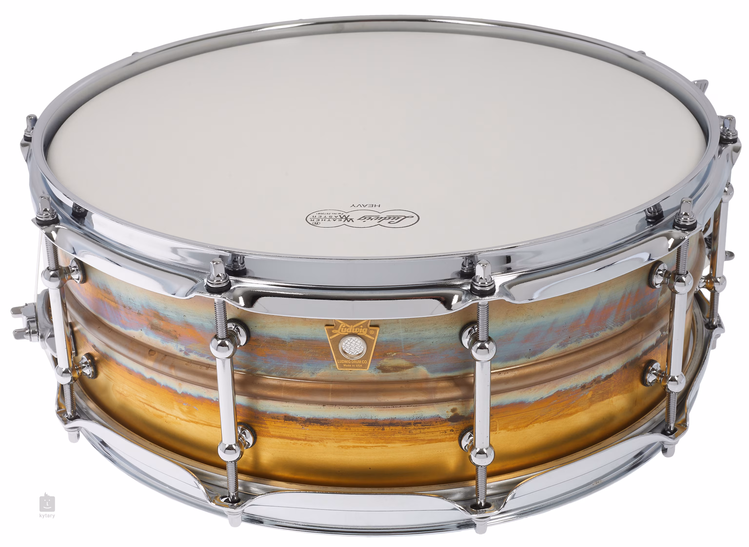Die Ludwig 14" x 5" Raw Brass mit Tube Lugs LB454RT verfügt über einen Korpus aus 1,2mm dickem, unlackiertem, nahtlosem Messing, dreifach gebogene 2,3mm dicke Stahlreifen, P88AC Throw Off + P35P Butt Plate Besaitungsmechanik, zehn Kessel (Tube Lugs) und Ludwig Weather Master Balg.