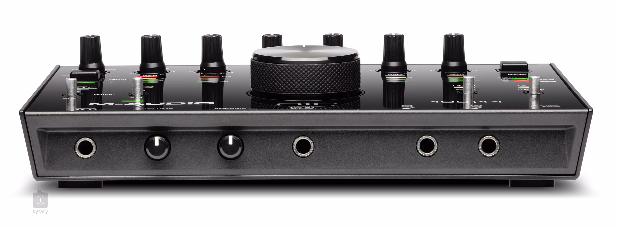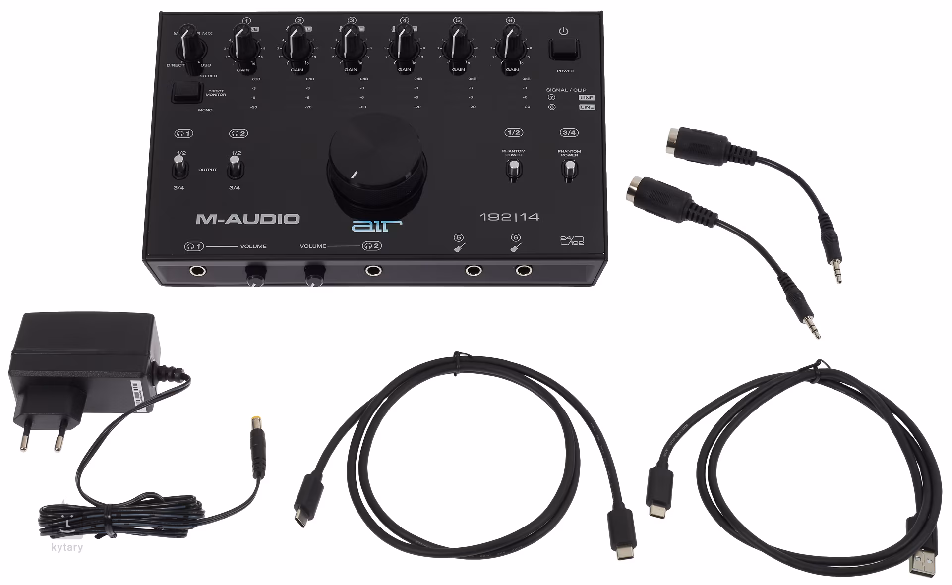 M-Audio AIR 192/14 Die 192/14 ist eine professionelle Sechs-Kanal-Soundkarte mit 192 kHz/24 Bit Klangqualität und eignet sich für detailliertes Monitoring während der Aufnahme oder Nachbearbeitung Ihrer Aufnahmen. Auf der Vorderseite befinden sich zwei Instrumenteneingänge für den Anschluss von Gitarren und Bässen sowie zwei Kopfhörerausgänge für die Arbeit in der Nacht und Kopfhörer-Lautstärkeregler für beide Kanäle. Auf der Oberseite befinden sich sechs Gain-Potentiometer für jeden Kanal, ein USB/Direct-Drehregler zum Mischen des Eingangssignals, eine große Hauptlautstärke, ein Mono/Stereo-Schalter für den Ausgang und ein Schalter für die Phantomspeisung der Mikrofoneingänge. Eine vierstufige LED-Skala zeigt die Lautstärke jedes Kanals detailliert an. Auf der Rückseite finden Sie zwei Paar Stereoausgänge für Studiomonitore oder Mischpult, vier Combo-Eingänge für Mikrofone oder andere Musikgeräte, einen Stereo-LINE-Eingang für Keyboards, MIDI In/Out und einen ultraschnellen USB (C)-Anschluss für PC oder Laptop. Zwei USB-Kabel, zwei 5-Pin-MIDI-Reduzierstücke und ein Softwarepaket sind im Lieferumfang enthalten.