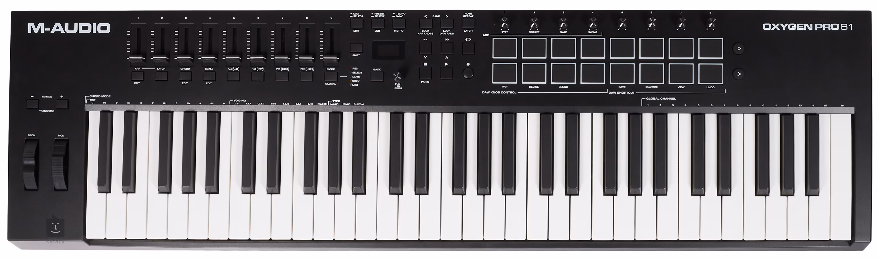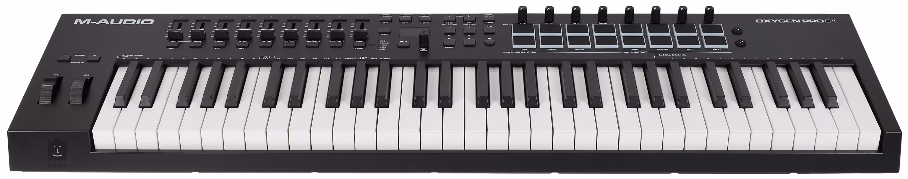 Das Oxygen Pro 61 wird über USB mit Strom versorgt und verfügt über ein OLED-Display, Smart-Chord- und Smart-Scale-Technologien, Auto-Mapping, einen integrierten Arpeggiator und eine Tonrepetitionsfunktion - unverzichtbare Merkmale und Funktionen für die moderne Musikproduktion von heute. Das Oxygen Pro 61 umfasst 61 halbgewichtete Tasten mit Aftertouch, 16 dynamisch reagierende Pads mit RGB-Hintergrundbeleuchtung, neun zuweisbare Fader und acht zuweisbare Controller. Auf der Rückseite befinden sich ein 5-poliger MIDI-Ausgang, ein USB-Anschluss und ein Eingang für ein Sustain-Pedal.