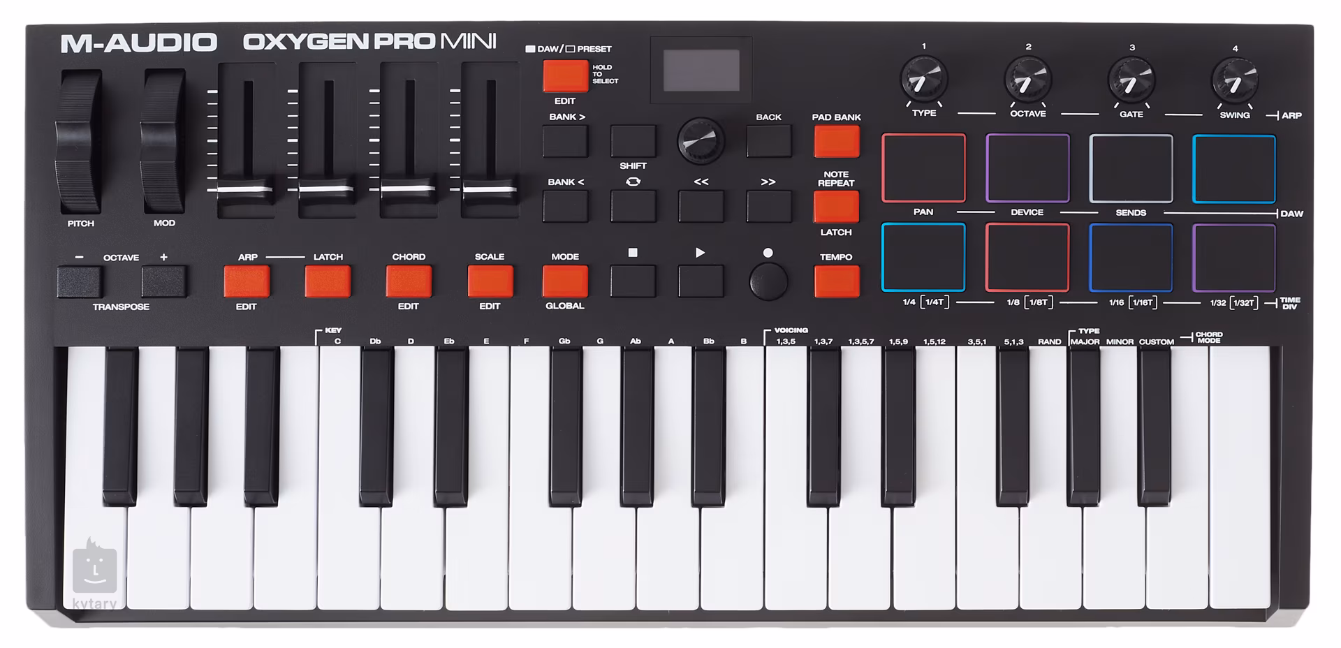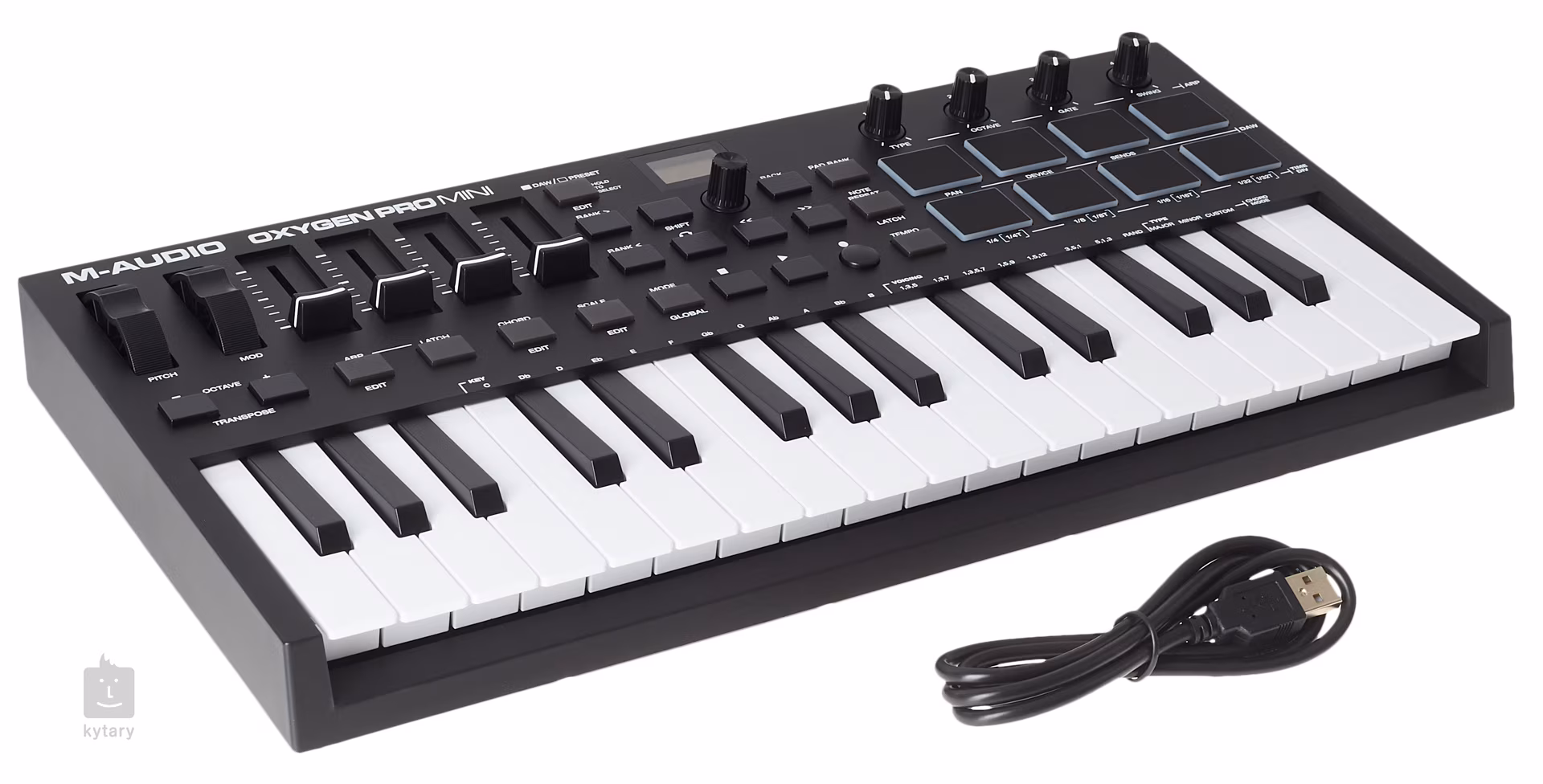 Oxygen Pro Mini wird über USB mit Strom versorgt und verfügt über ein OLED-Display, Smart-Chord- und Smart-Scale-Technologien, Auto-Mapping, einen integrierten Arpeggiator und eine Tonrepetitionsfunktion - unverzichtbare Merkmale und Funktionen für die moderne Musikproduktion von heute. Das kompakte Oxygen Pro Mini umfasst 32 halbgewichtete Minitasten mit Aftertouch, 8 dynamisch reagierende Pads mit RGB-Hintergrundbeleuchtung, vier zuweisbare Fader und vier zuweisbare Controller. Auf der Rückseite befinden sich ein MIDI-Ausgang, ein USB-Anschluss und ein Eingang für ein Sustain-Pedal.