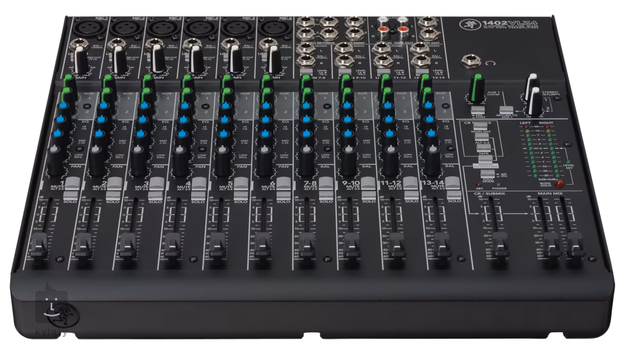 Das 1402-VLZ4 ist ein kompaktes 14-Kanal-Mischpult mit 14 Line-Eingängen und 6 Mikrofon-Eingängen, wobei die Mikrofon-Eingänge mit den hochwertigen Onyx-Vorverstärkern ausgestattet sind, die Sie vielleicht von Mackies Top-Produkten kennen. Diese bieten einen Verstärkungsbereich von bis zu 60 dB, so dass Sie einen Dynamikbereich von bis zu 128,5 dB erreichen können. Sie bieten die beste Signalverstärkung bei allen Frequenzen und minimale Verzerrungswerte. Natürlich bietet es auch Phantomspeisung bei Verwendung von Kondensatormikrofonen. Die Instrumenteneingänge können auch mit dem 1402-VLZ3 verwendet werden, so dass Sie keine DI-Boxen benötigen.