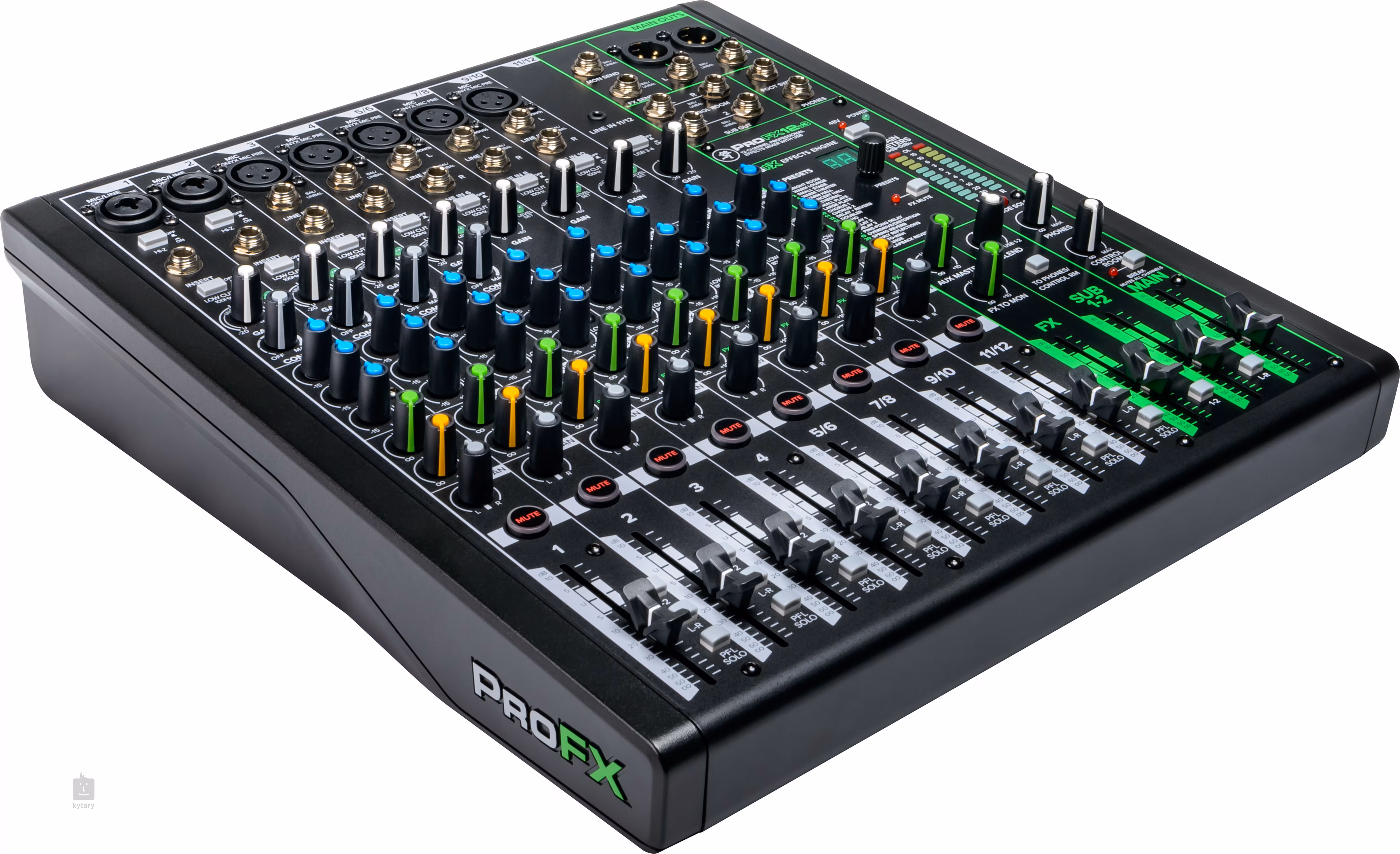 Das ProFX12v3 ist ein zwölfkanaliges Mischpult mit sieben Onyx-Vorverstärkern und einer GigFX-Sound-Engine. Der Sound kann über intuitive Bedienelemente und einen Dreiband-EQ auf jedem Kanal eingestellt werden. Zusätzlich zu den beiden XLR/Klinke-Combo-Eingängen verfügt das Pult über einen Hi-Z-Eingang für den direkten Anschluss von Gitarre/Bass, fünf XLR/Stereo-Klinkeneingänge und einen Line IN für einen Musikplayer oder ein mobiles Gerät. Außerdem gibt es einen Monitorausgang, einen Hauptausgang, einen Kopfhörerausgang und einen Fußschaltereingang.