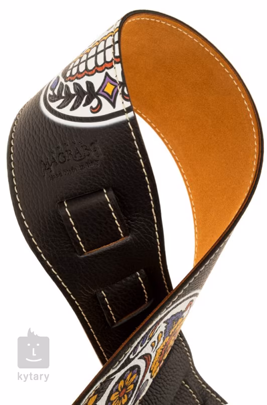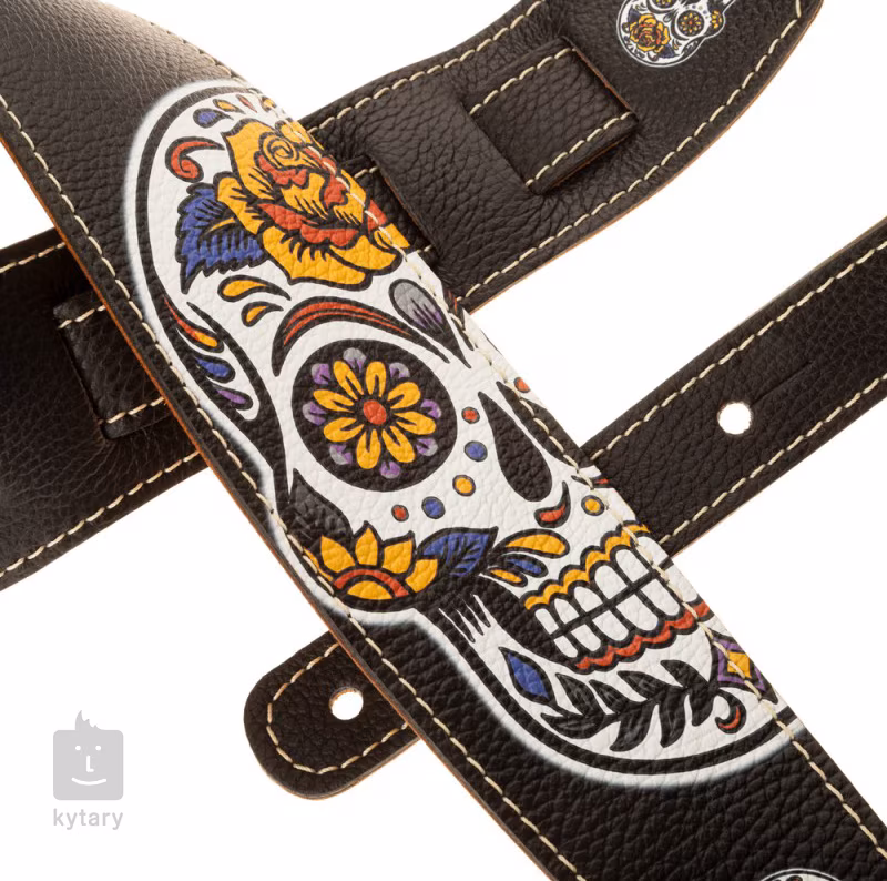 Der Gitarrengurt Holes HS Art Print Calavera Black 8 cm der italienischen Marke Magrabò ist aus echtem Leder gefertigt, was ihm eine lange Lebensdauer, Widerstandsfähigkeit und hohen Tragekomfort verleiht. Auf den ersten Blick besticht er durch sein auffälliges Design, das von einer farbenfrohen Totenkopfzeichnung auf schwarzem Hintergrund dominiert wird. Das hochwertige Leder passt sich beim Tragen perfekt Ihrem Körper an und bietet Ihnen so auch bei langem Spielen im Stehen Komfort. Dazu trägt auch die 8 cm Breite des Gurtes bei, die für eine gleichmäßige Verteilung des Gewichts des Instruments auf Ihrem Rücken sorgt. Dank der einstellbaren Länge von 105 bis 142 cm ist der Gurt für die meisten Spieler geeignet, unabhängig von ihrer Körpergröße. Ideal für Akustik-, E- und Bassgitarren.