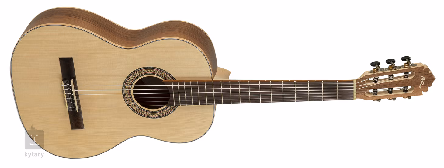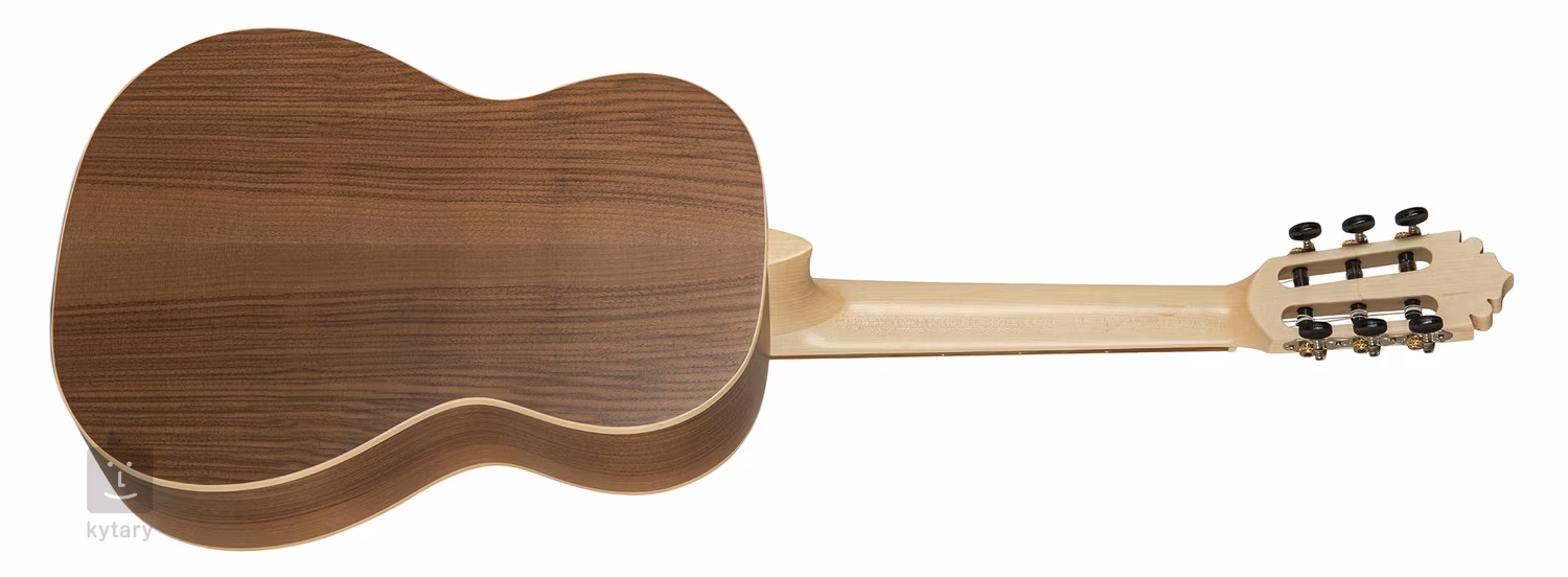 ECOLOGÍA Serie E-62 7/8 Größe "Senorita" ist eine klassische Gitarre in 7/8 Größe. Die Vorderseite des Instruments ist aus massiver Fichte, Boden und Zargen sind aus laminiertem Nussbaum. Die Gitarre verfügt außerdem über einen Ahornhals, ein Akaziengriffbrett, eine Nullbund- und Griffbretteinlage aus synthetischem Bonoidmaterial mit hohem Glasanteil (ähnlich dem TusQ-Material), in den Niederlanden hergestellte Van-Gent-Stimmmechaniken mit schwarzen Wirbeln sowie traditionelle Elemente in Form von Ahorn-Korpuseinfassung, Zierrosette und Walnussfurnier auf der Kopfplatte.