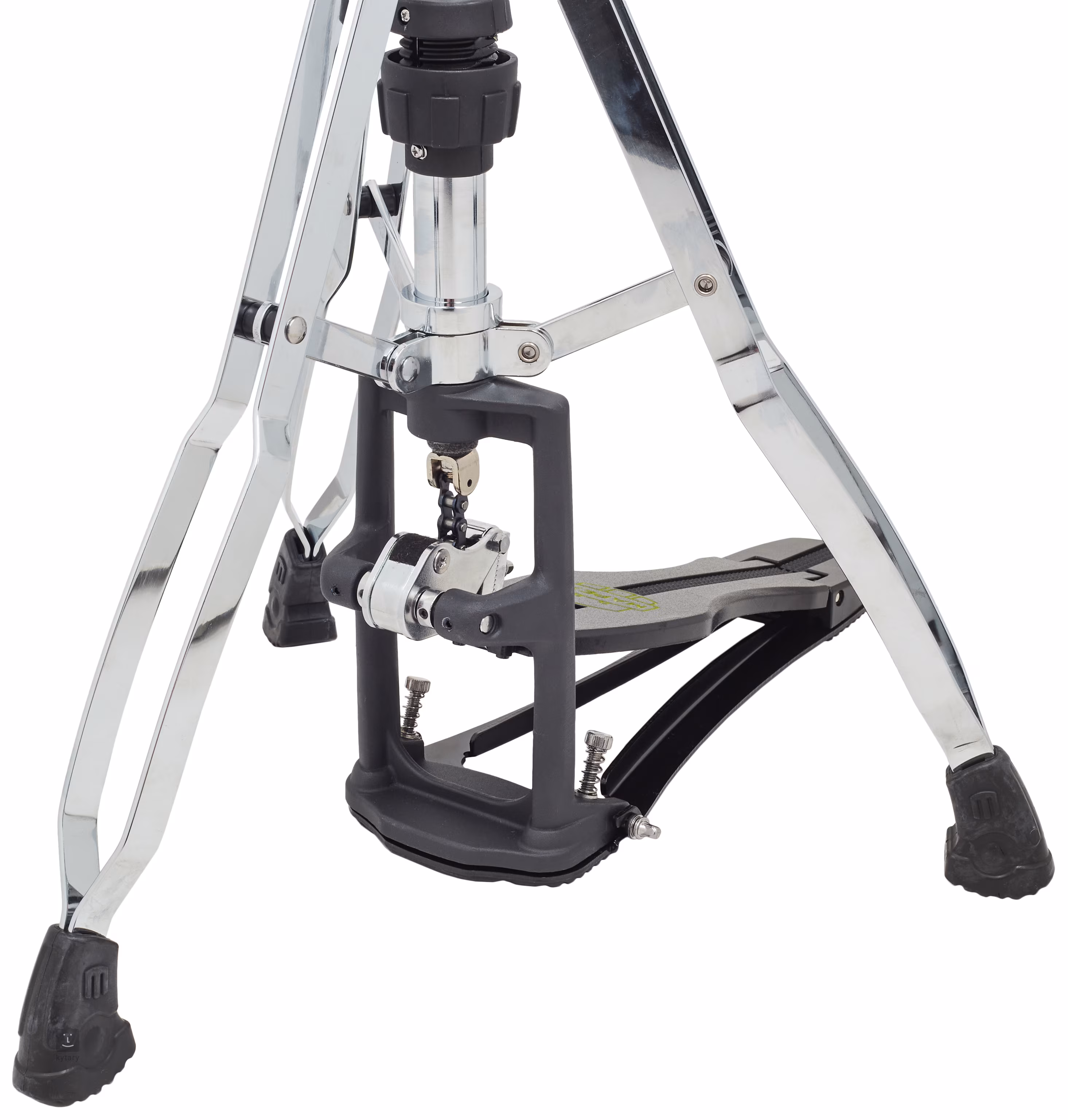 Dieser Hi-Hat-Ständer verfügt über ein Standard-Riemenscheibengetriebe (Tru-Direct-Pull Drive), einen Beckenhalter mit 10-stufiger Druckeinstellung, eine abnehmbare, verlängerte Pedalbasis aus Stahl oder spezielle Pads für langes Sustain.
