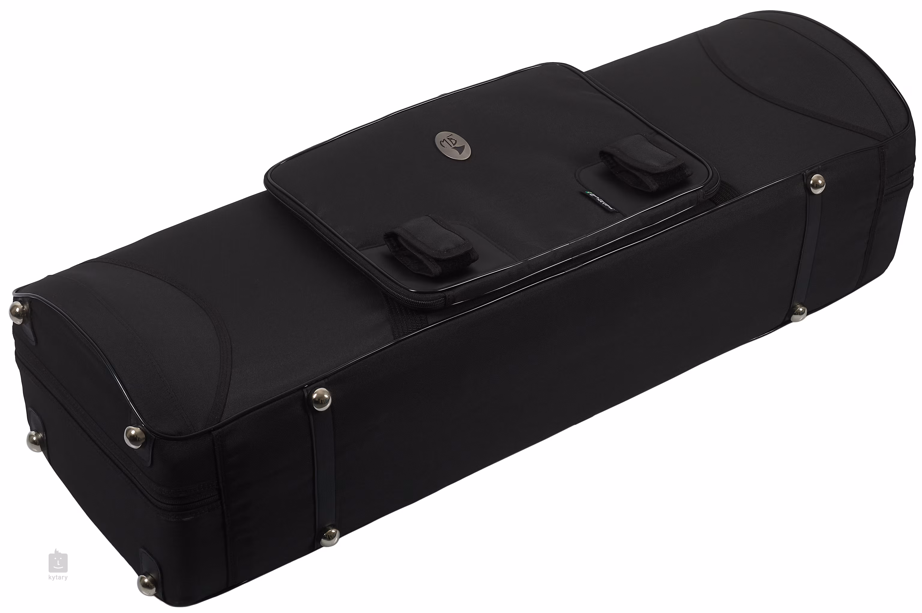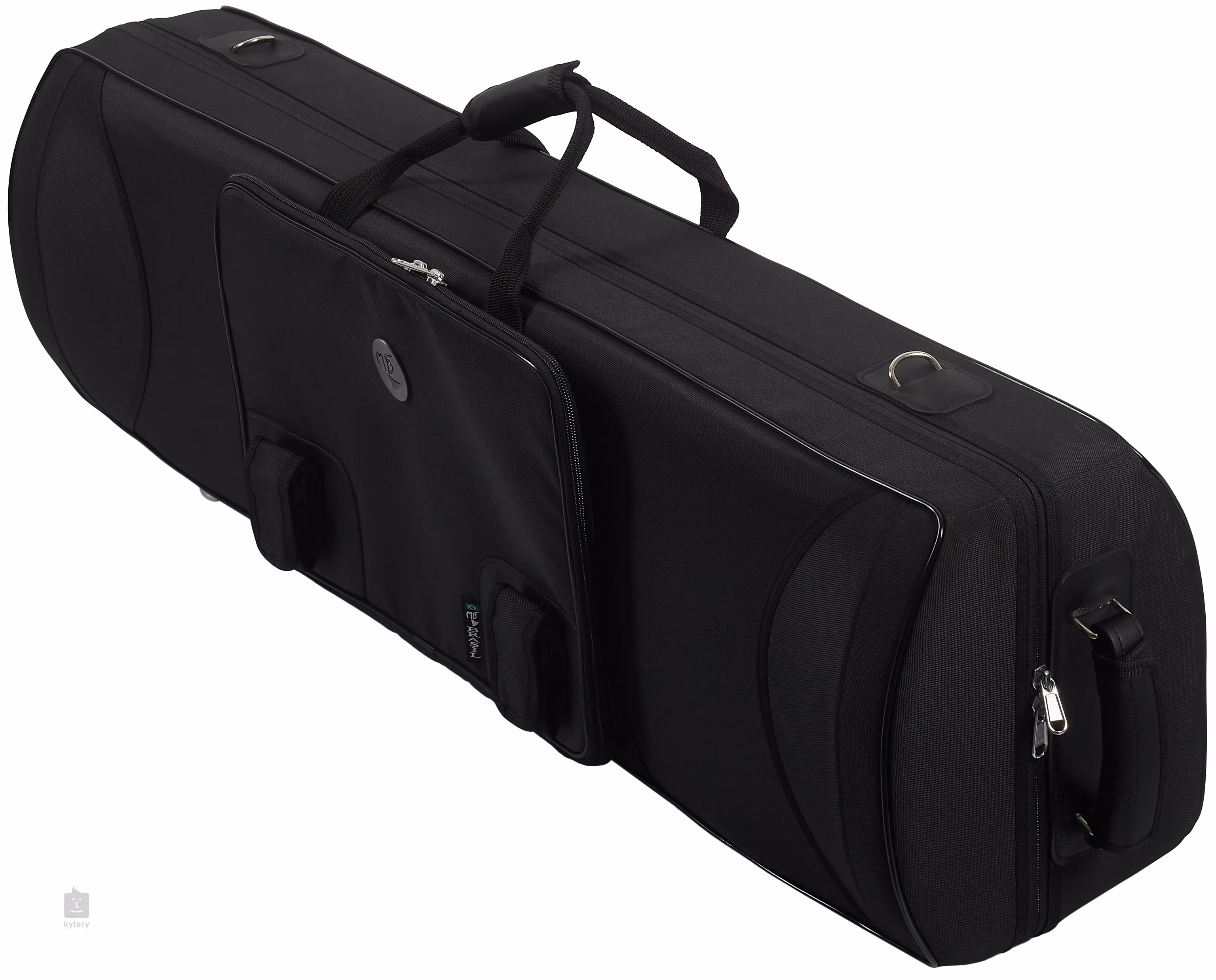 Marcus Bonna Koffer für zwei Tenorposaunen mit einer Schallbecherbreite von bis zu 216 mm (8,5 Zoll). Die Konstruktion aus Glasfaser oder Kohlefaser ist außen mit einer Nylonhülle und innen mit nylonbeschichtetem Schaumstoff ausgekleidet. Die Posaunen im Koffer werden durch eine Schaumstoffeinlage voneinander getrennt, die Saiten können in separaten Fächern verstaut werden. Im Innenraum befindet sich auch ein Fach mit einer Hülle für drei Mundstücke. Weitere kleine Accessoires können in der abnehmbaren Außentasche mit Reißverschluss verstaut werden, die auch als Notenmappe verwendet werden kann.