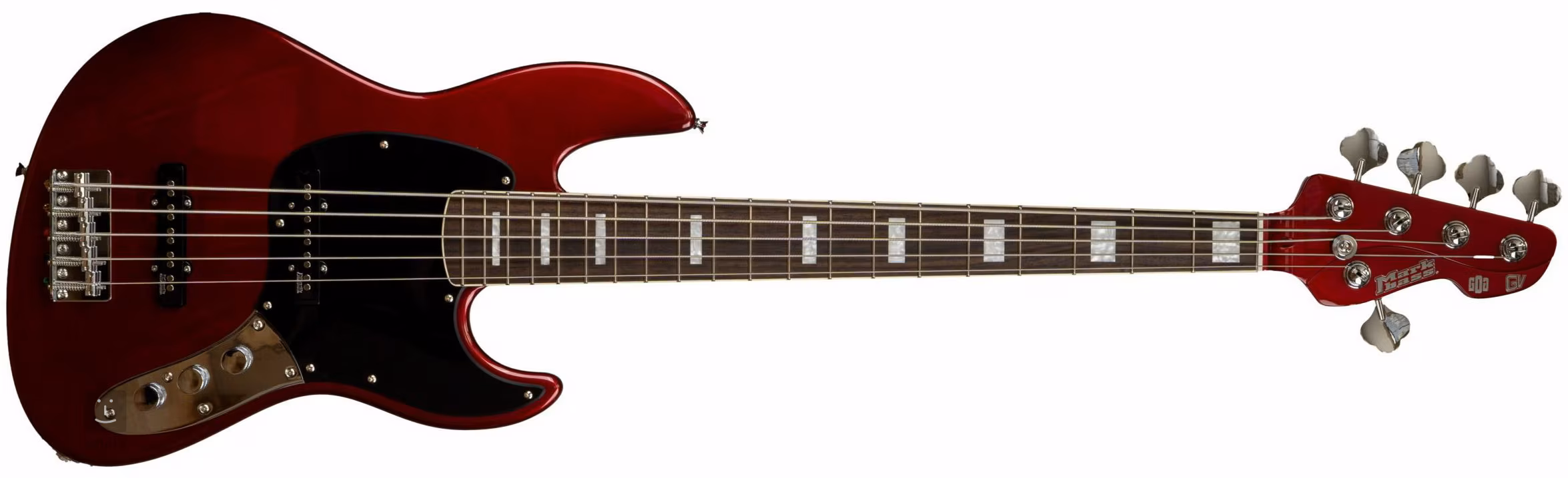 Der GV5 Gloxy GOG Red Passion CR RW FC ist ein fünfsaitiger E-Bass im JB-Stil, dessen Design von Markbass-Topkünstler Andrew Gouchè genehmigt wurde, der oft als "Godfather of Gospel"-Bassist bezeichnet wird (daher das GOG im Namen). Der Korpus des Basses ist aus ausgesuchter Erle gefertigt. Auf den Ahornhals ist ein Palisandergriffbrett mit zwanzig Bünden geklebt. Die Ausrichtung des Griffbretts wird durch Positionsblöcke erleichtert.