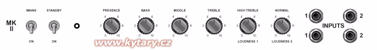 Die Frontplatte ist nach dem Motto "Einfachheit ist Macht" gestaltet. Hier finden Sie die traditionellen vier Eingänge - die rechten Eingänge gehören zum ersten Kanal, die linken zum zweiten Kanal, die obere Reihe sind die sogenannten High-Eingänge, die unteren Low-Eingänge, jeder Kanal hat natürlich eine etwas andere Klangcharakteristik. Die einzigen separaten Kanalregler sind Loudness 1 und Loudness 2, die, da es sich um eine Nicht-Master-Volume-Maschine handelt, die Lautstärke bestimmen, mit der auch die Verzerrung des Klangs zunimmt. Hier kommt die Dynamik Ihres Spiels erst richtig zum Tragen. Auf der Vorderseite befinden sich lediglich die Regler für Bass, Mitten und Höhen als Standard-3-Band-EQ sowie das Presence-Potentiometer, mit dem das Verhalten der oberen Mitten bei Endstufenpegel eingestellt wird.