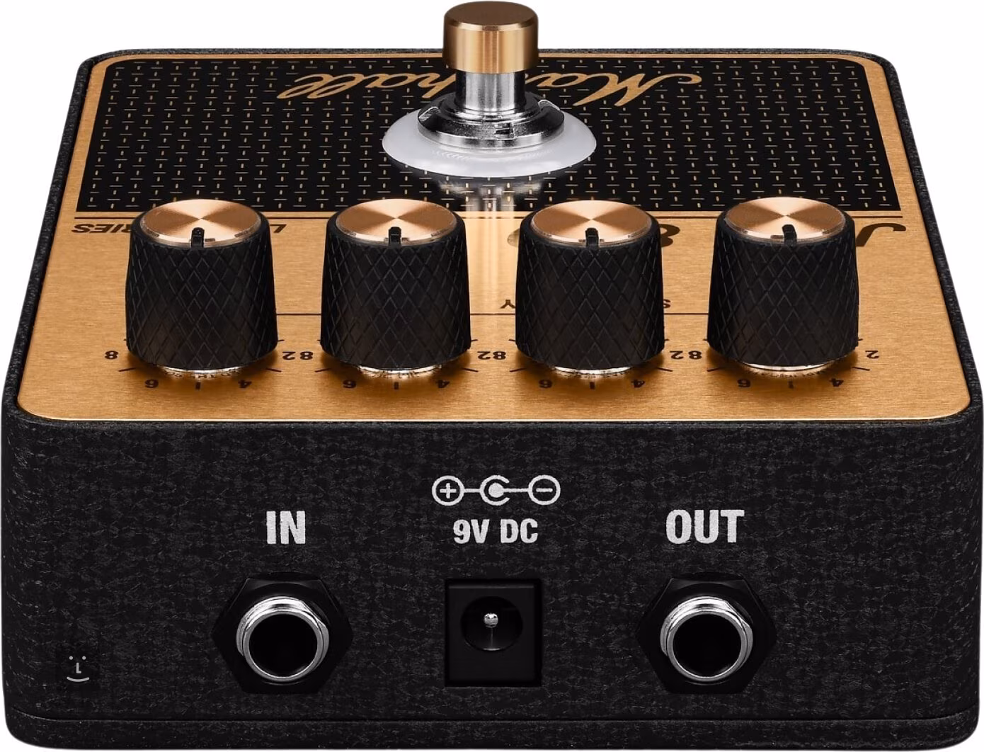 Das Bedienfeld bietet eine intuitive Steuerung mit den Reglern Gain, Sensitivity, Tone und Volume. So können Sie Ihren Sound ganz nach Ihrem Geschmack einstellen. Für die Stromversorgung des Effekts wird entweder ein Standard-9V-Adapter (nicht im Lieferumfang enthalten) oder eine 9V-Batterie verwendet. Die Box ist als True Bypass verdrahtet. Die gesamte Elektronik ist in einem robusten Metallgehäuse untergebracht.