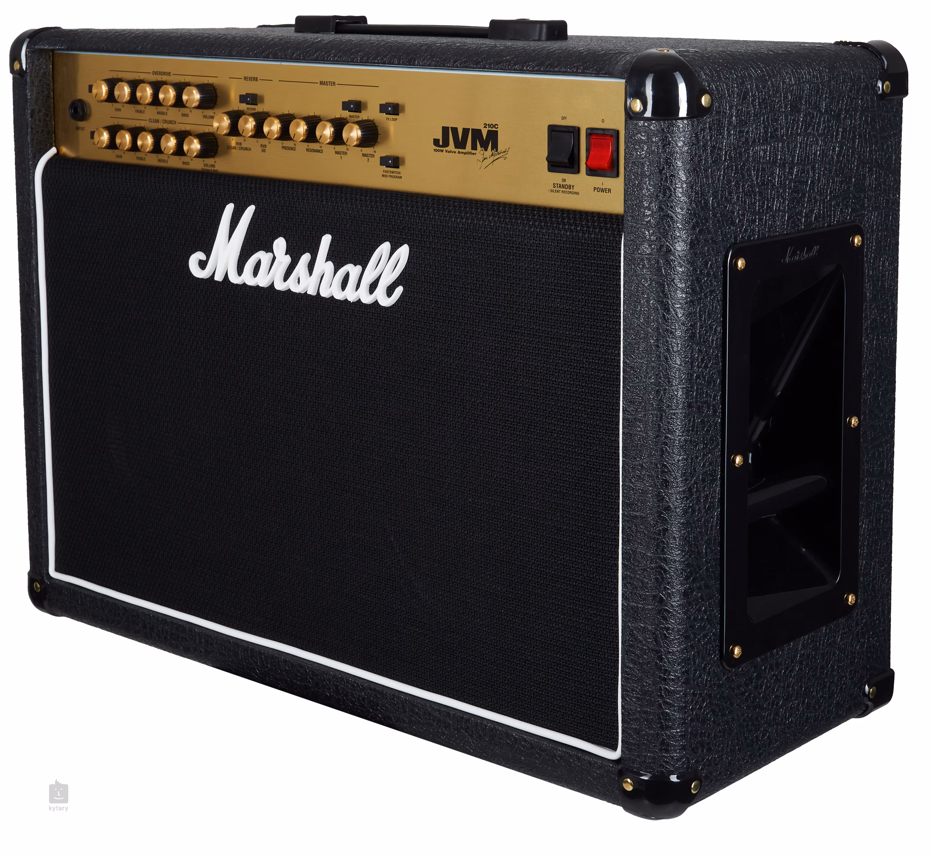 JVM 210C Der 210C gehört zu den einfacheren Modellen der JVM-Serie, ist aber dennoch eine mehr als gute Wahl auch für die anspruchsvollsten Gitarristen, die im Proberaum oder auf Clubbühnen klanglich durchbrechen wollen. Es handelt sich um einen Vollröhrenverstärker, im Vorverstärker befinden sich fünf ECC83, der Endverstärker erzeugt dank vier EL34-Röhren eine Leistung von bis zu 100 W. Für die Umwandlung der Leistung in Klang sorgen zwei Celestion Vintage- und Heritage-Lautsprecher mit einem Durchmesser von 12 Zoll.