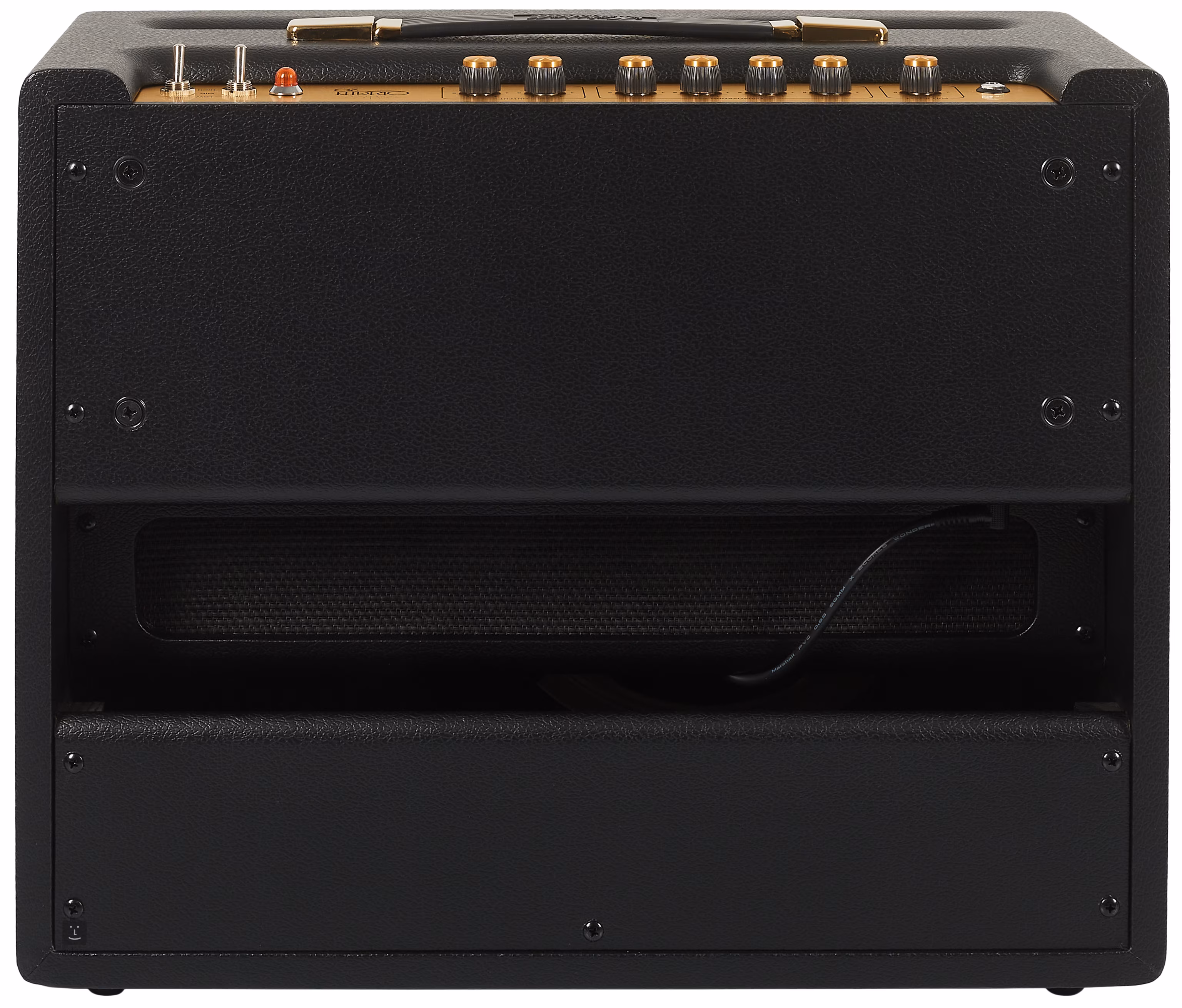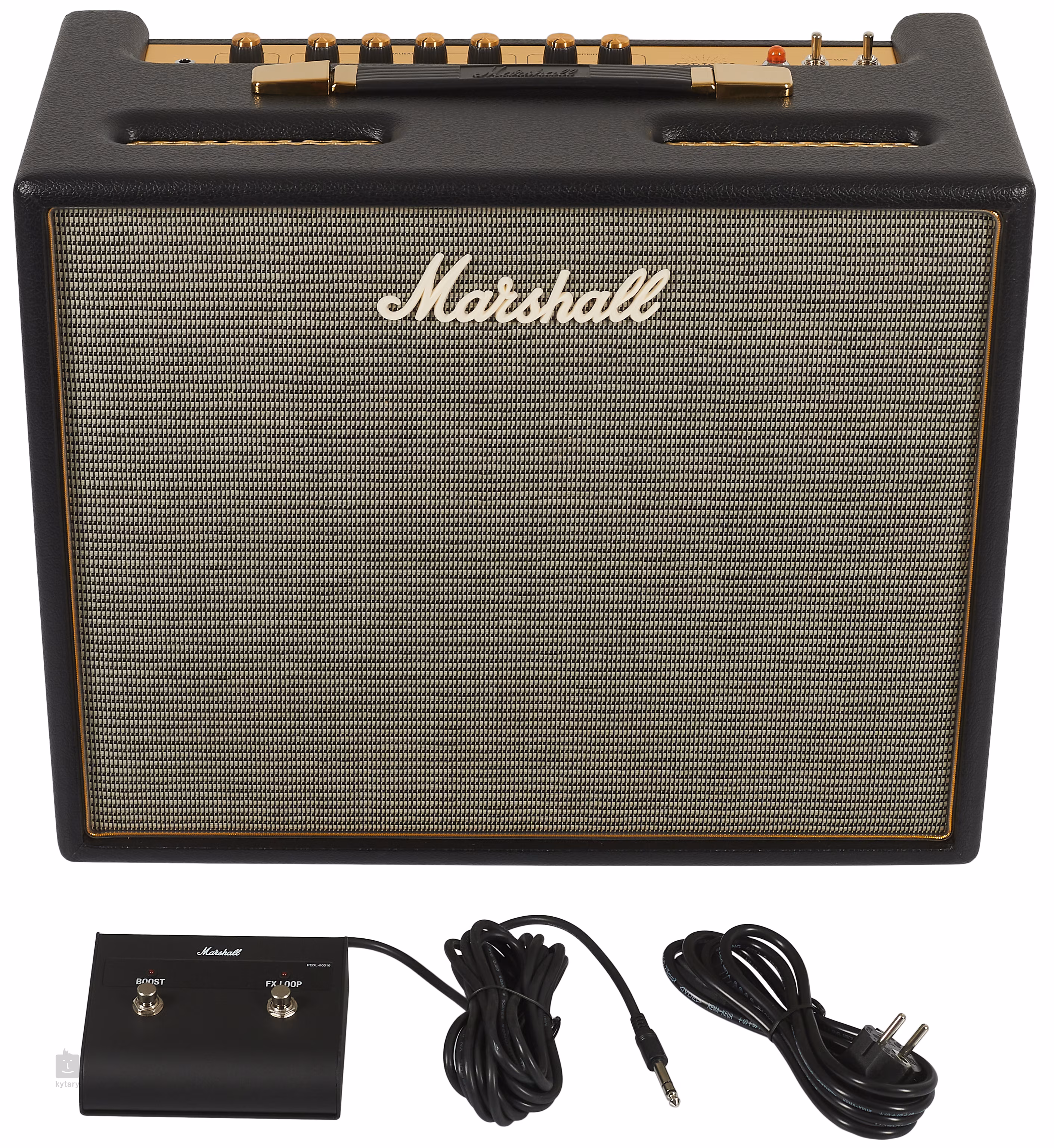 Das Fehlen integrierter Effekte und eines höheren Gains wird durch die Möglichkeit ausgeglichen, externe Pedaleffekte über den Effektloop-Ein-/Ausgang anzuschließen, mit denen alle Marshall Origin-Verstärker mehr als gut zurechtkommen. Auf der Rückseite finden Sie außerdem einen Eingang für einen Fußschalter, drei Ausgänge für externe Lautsprecherboxen mit einer Impedanz von 8 und 16 Ohm und einen DI-Ausgang mit Lautsprecherbox-Emulation für den direkten Anschluss des Combos an ein Mischpult. Ein Fußschalter mit zwei Tasten ist im Lieferumfang enthalten (Steuerung der Funktionen Gain Boost und Effektschleife).