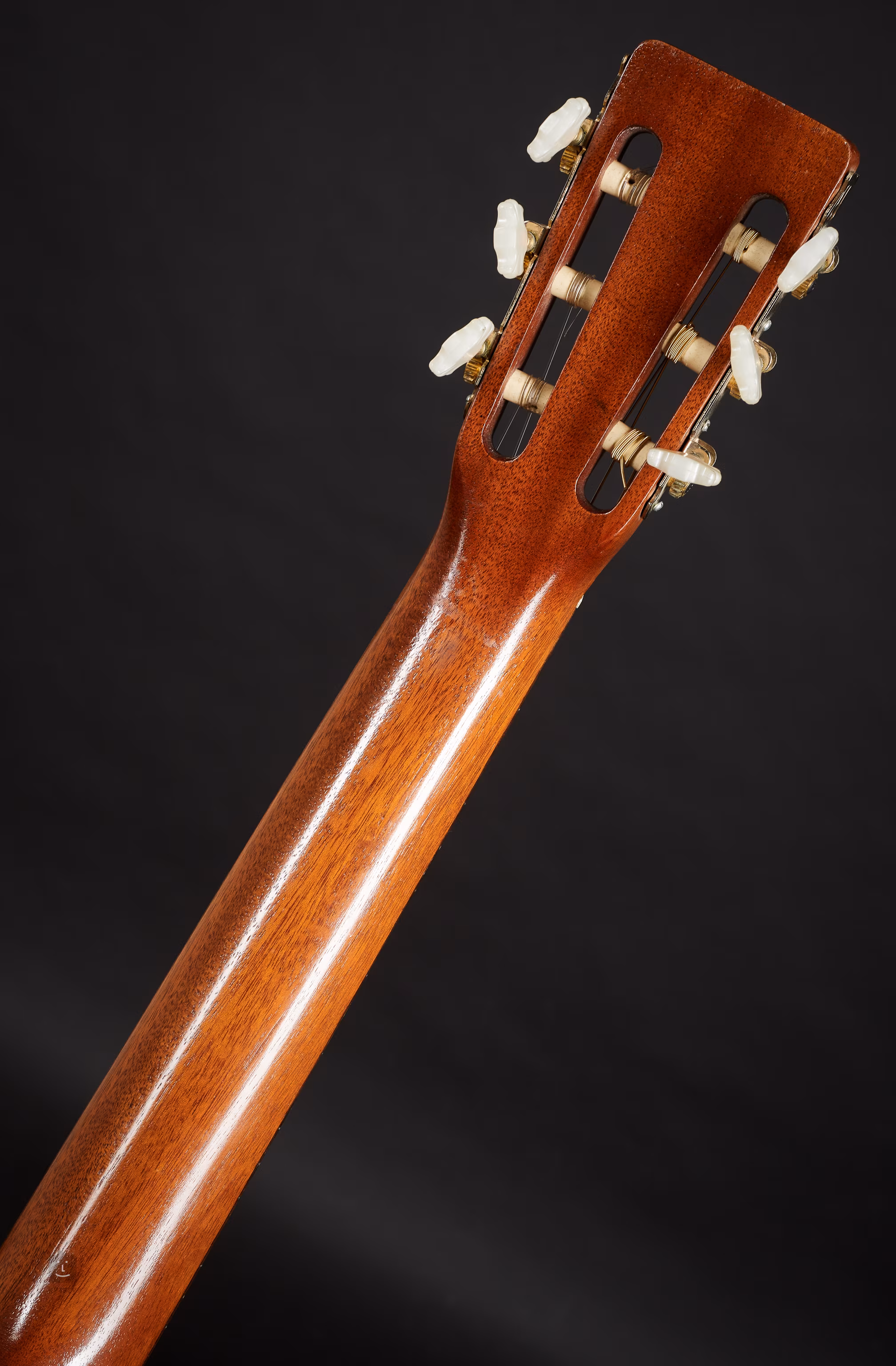 Das Instrument wurde einer Reihe von Reparaturen unterzogen, die seinem Alter entsprechen. Der Korpus wurde von dem dunklen Lack auf der Rückseite befreit, so dass Sie das Martin-Logo auf der Rückseite der Kopfplatte nicht mehr finden, aber glücklicherweise hat das Instrument auch im Inneren des Korpus eine Datierung und Identifizierung; auf der Unterseite des Balgs wurde ein neues Stück Holz ausgelegt und der umliegende Bereich mit schwarzer Farbe lackiert; das Griffbrett wurde bereits neu eingefasst; das Palisander-Griffbrett wurde neu gepresst; die Stimmmechaniken sind neuer.