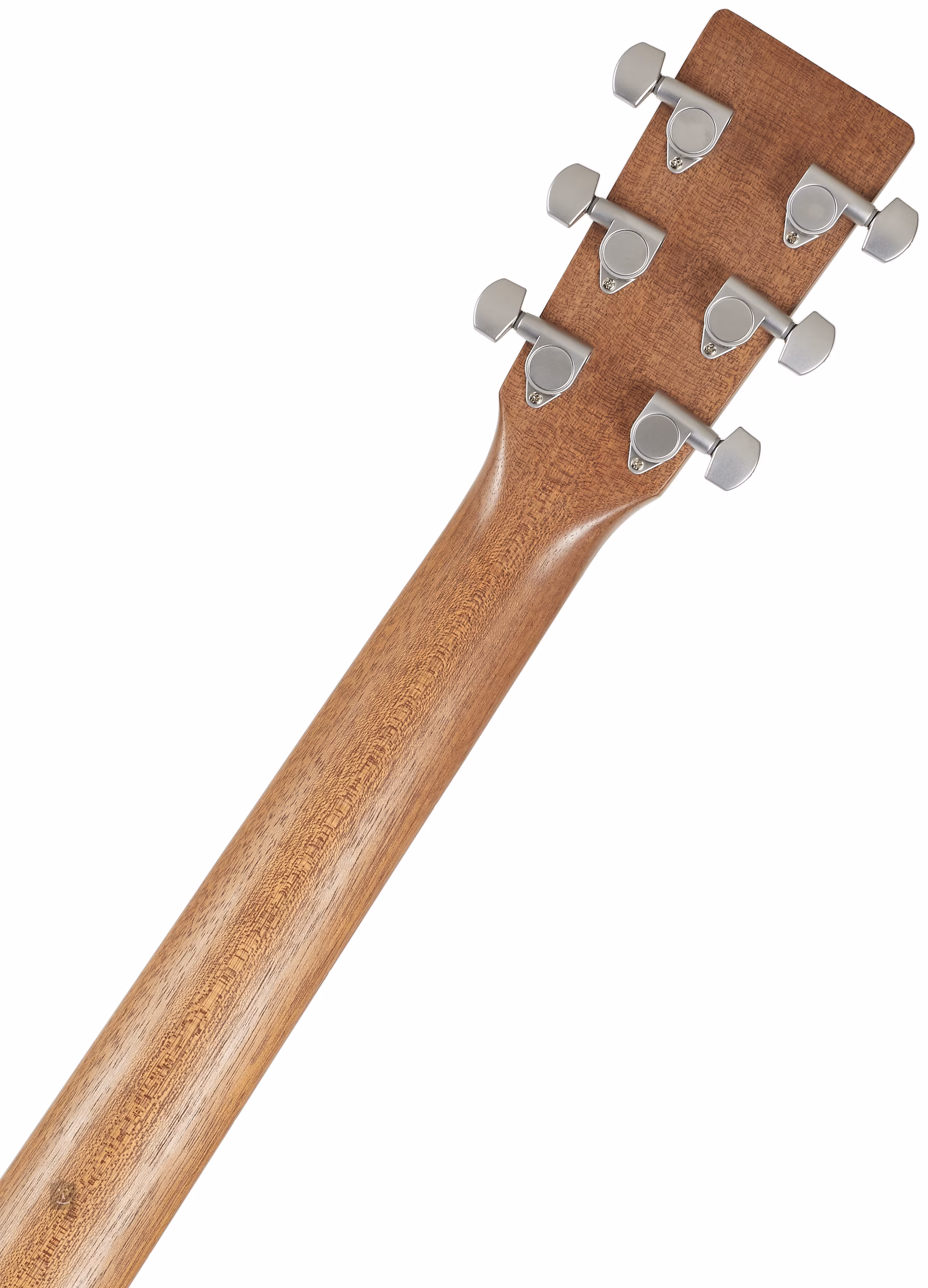Der Hals aus ausgewähltem Hartholz, der standardmäßig am 14. Bund mit dem Korpus verbunden ist, wird durch ein 20-Bund-Griffbrett aus Hartholz ergänzt. Ein TusQ-Verbundstoff-Sattel auf einem Hartholz-Griffbrett verleiht den Saiten zusammen mit dem Corian-Griffbrett hervorragende Resonanz und Sustain. Das stilvolle Finish wird durch geschlossene Chrom-Mechaniken und eine Rosette aus Perlmuttimitat (Abalone-Muster) akzentuiert.