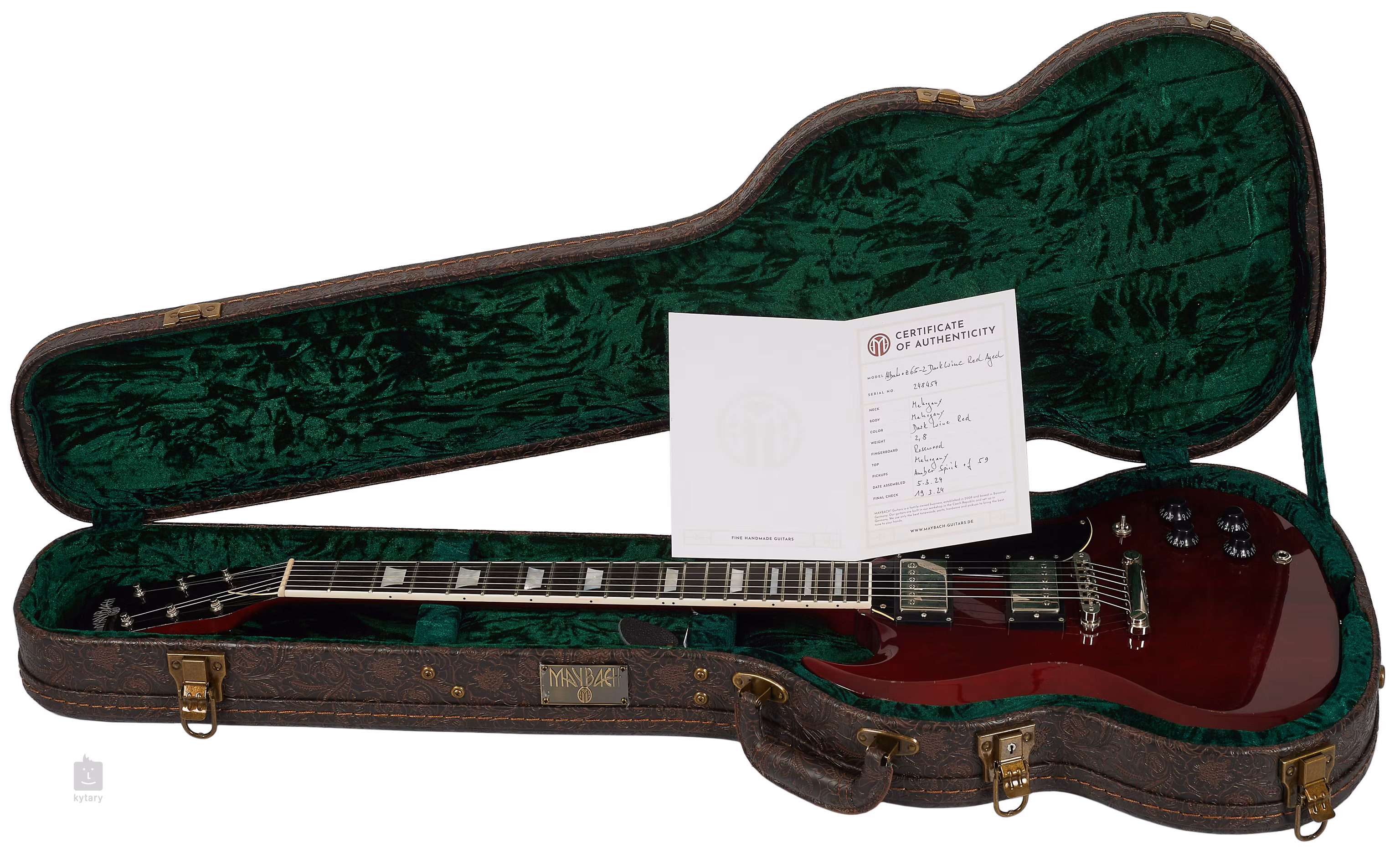 Die Maybach Albatroz '65-2 Dark Wine Red ist eine Double-Cut-E-Gitarre im SG-Stil, die alle klassischen Zutaten bietet, die man mit diesem Instrument assoziiert: einen leichten Mahagonikorpus mit flacher Decke, zwei Cutaways und konturierten Kanten, einen Mahagonihals und ein Palisandergriffbrett mit zweiundzwanzig Medium-Jumbo-Bünden.