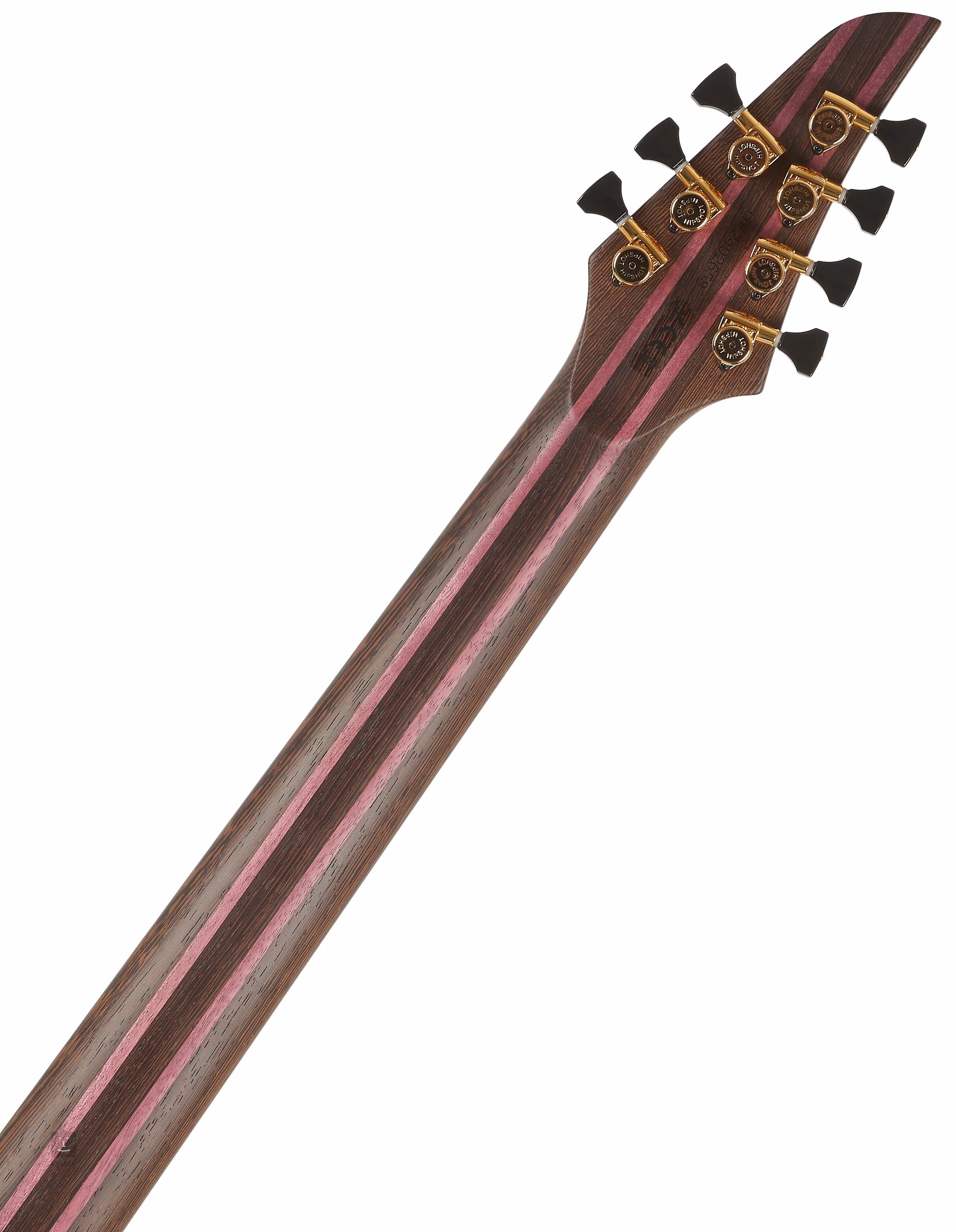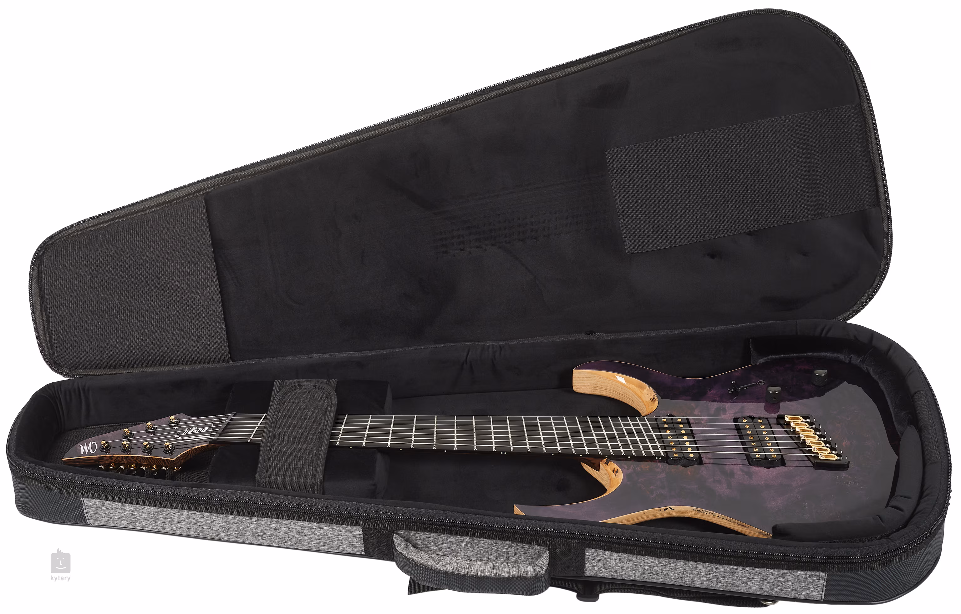 Gute Stimmung und Sustain werden durch die Saitenbefestigung über den Nullbund (Graphtech Black TusQ) im Hipshot Griplock Locking Mechanismus und über die Hipshot VF 7 Solid Bridge durch den Korpus der Gitarre unterstützt. Das luxuriöse Design wird durch das beeindruckende Trans Dirty Purple Gloss Korpusfinish und die Mixed Gold Hardware akzentuiert.