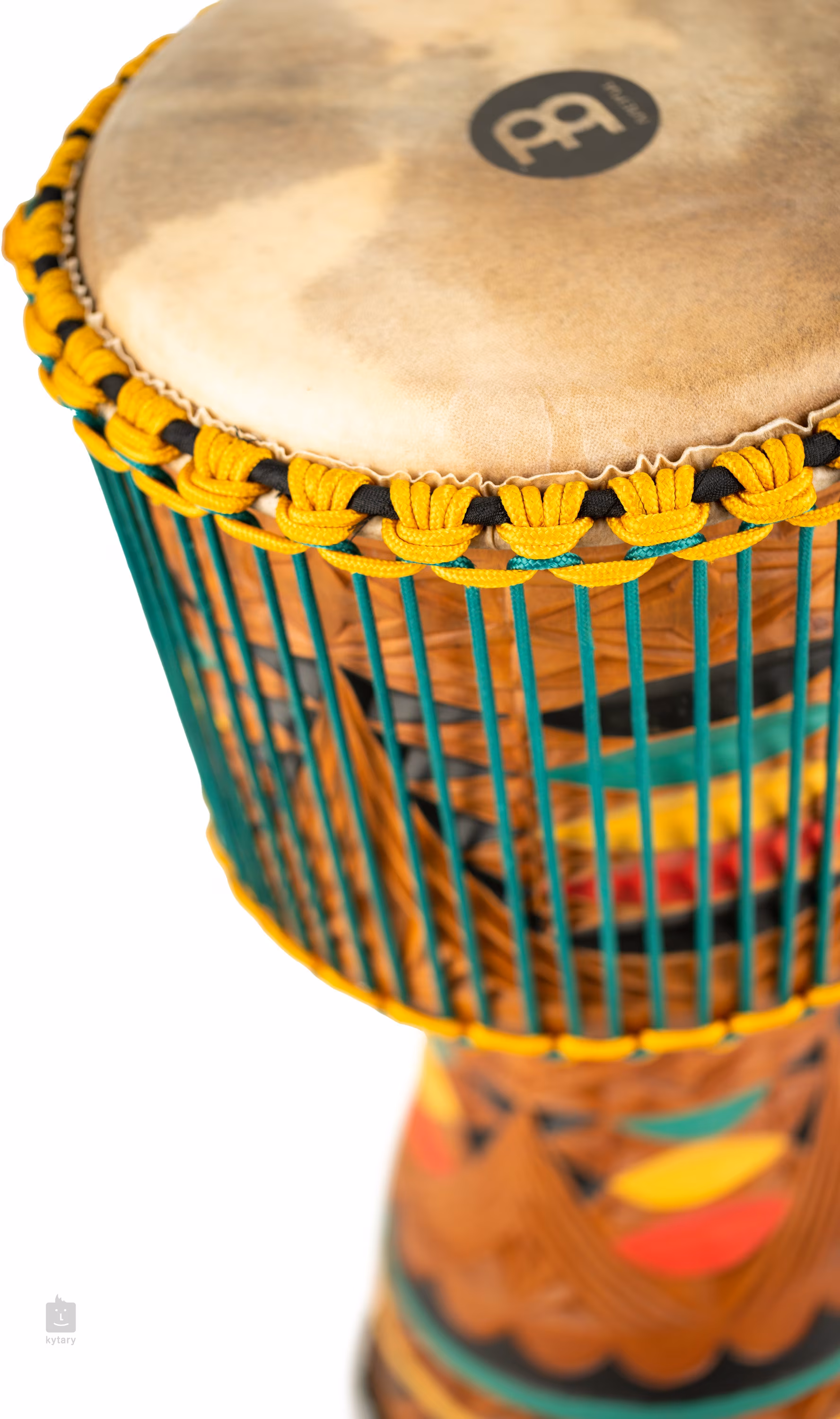 Der Korpus der Djembe besteht aus einem einzigen Stück massivem Mahagoni, was maximale Resonanz und Langlebigkeit garantiert. Für eine zuverlässige und stabile Stimmung sorgt das traditionelle Mali-Weave-Schnursystem mit vorgespannten HTP-Nylonschnüren, deren Farbe das Design des gesamten Instruments harmonisch ergänzt. Der Durchmesser von 12 Zoll und die Höhe von 24 Zoll sind ideal, um einen vollen Klang und einen breiten Dynamikbereich zu erzielen. Ein praktisches Detail ist die strapazierfähige Gummibasis an der Unterseite des Korpus, die das Instrument vor Kratzern schützt und für Stabilität beim Spielen sorgt.