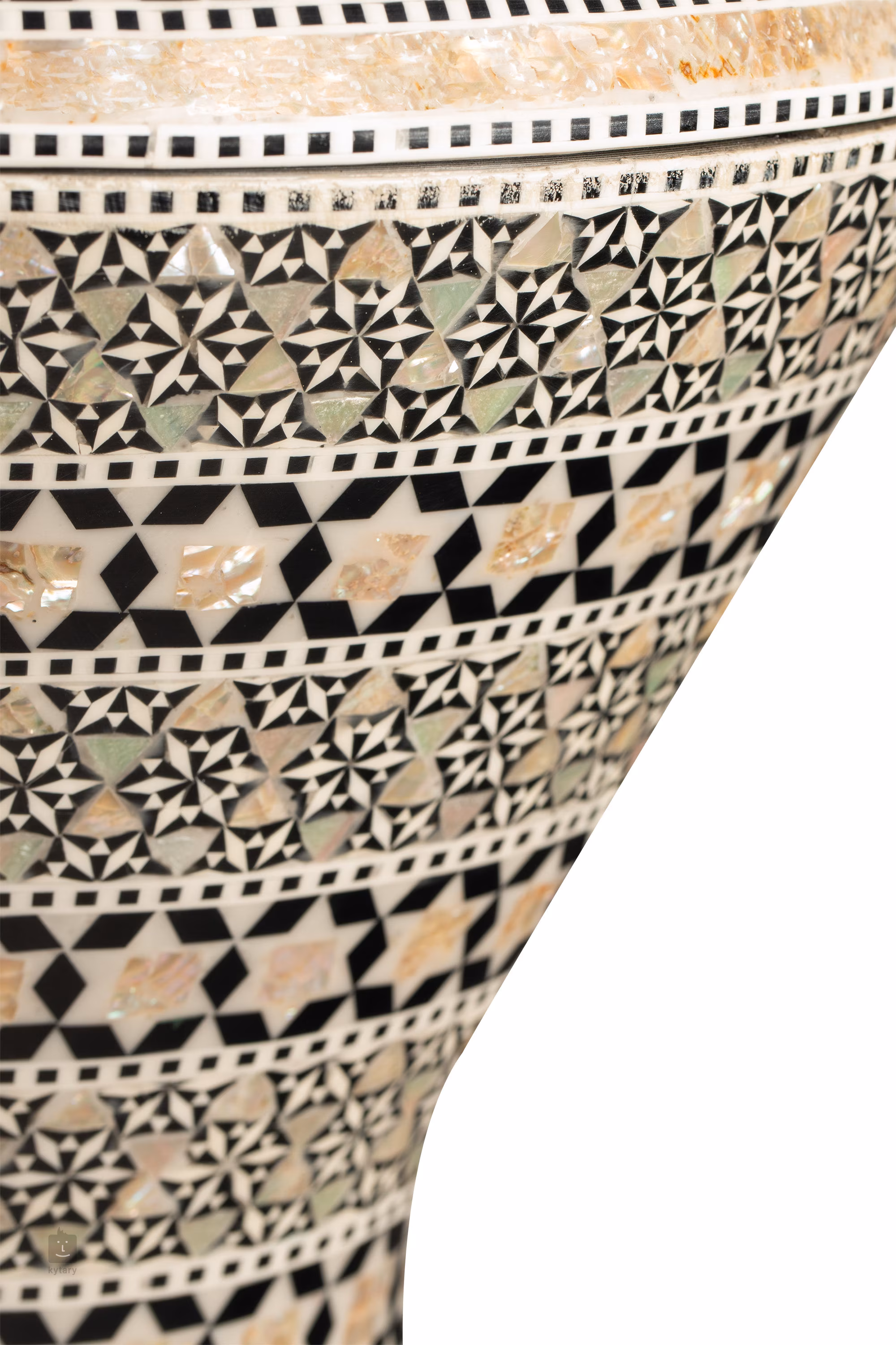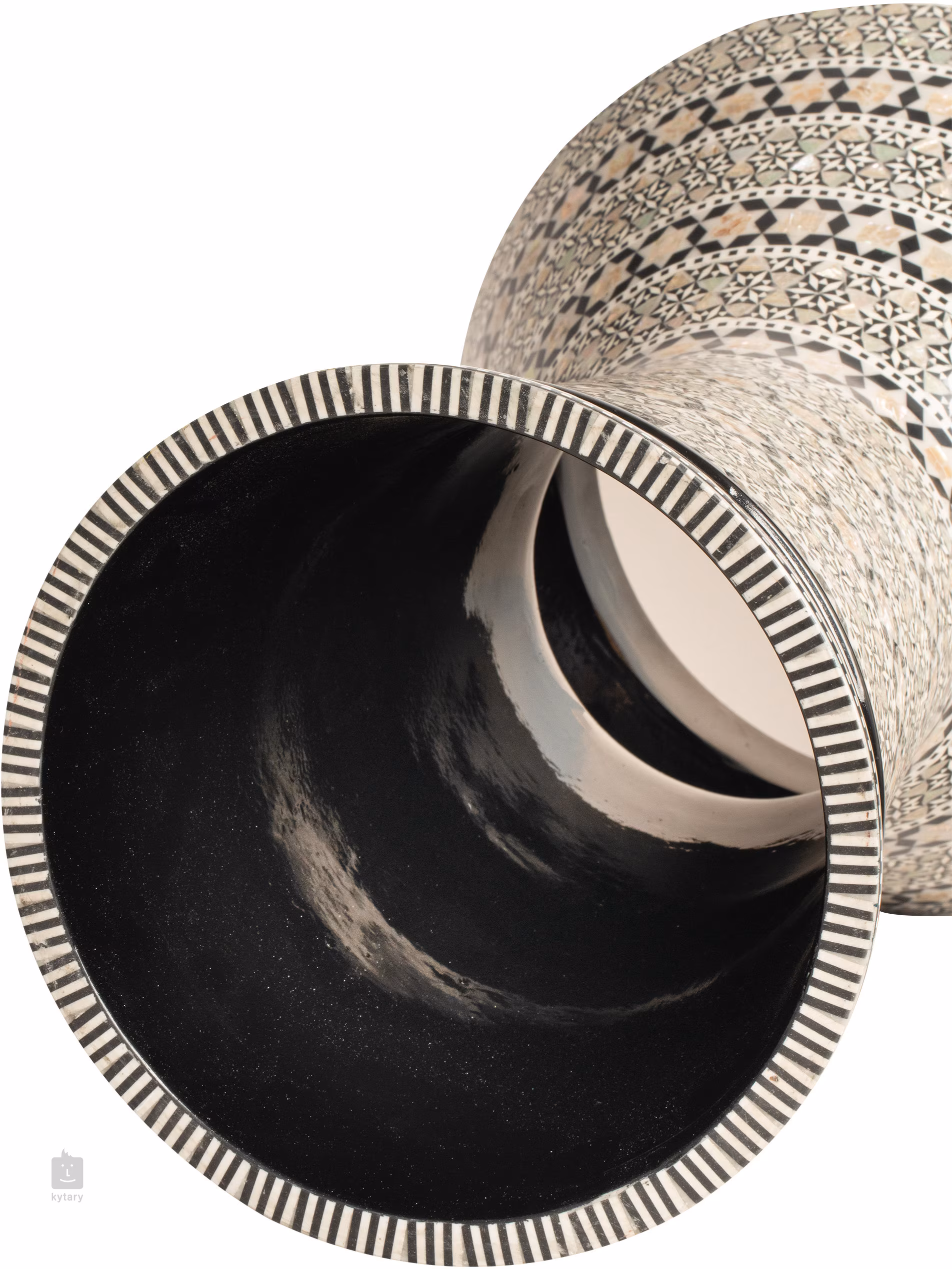 Der Korpus der Doumbek besteht aus massivem Aluminium, das für Stabilität, Langlebigkeit und einen klaren, durchdringenden Klang sorgt. Die reich verzierte Oberfläche mit handgefertigtem Perlmuttmosaik verleiht dem Instrument ein luxuriöses Aussehen und verweist gleichzeitig auf die traditionelle Ästhetik des Nahen Ostens. Jedes Stück wirkt wie ein einzigartiges Kunstwerk, das nicht nur durch seinen Klang, sondern auch durch sein Design besticht.