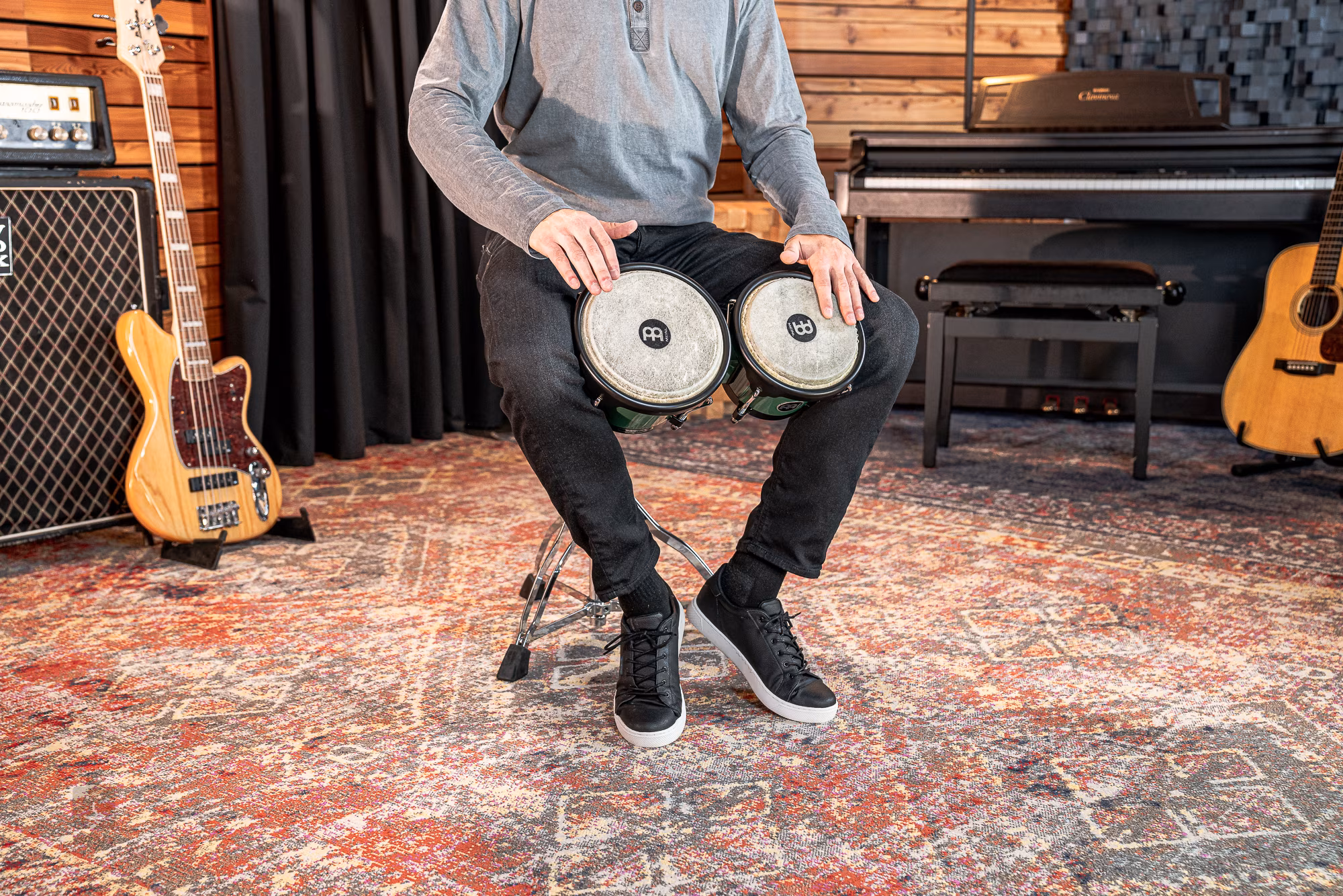 Die Bongos der Journey-Serie von Meinl sind eine gute Wahl für alle, die ein robustes Instrument für die Reise suchen, aber auch für Anfänger und fortgeschrittene Spieler, die ein gutes Preis-Leistungs-Verhältnis suchen. Ihre Körper haben eine traditionelle Form und sind aus umweltfreundlichem, extrem haltbarem ABS-Kunststoff gefertigt. Für den hochwertigen Klang sorgen Bälge aus ausgesuchtem Büffelleder, die sich dank der 8 mm starken, schwarz sandgestrahlten Reifen, deren Kanten für maximalen Spielkomfort abgerundet sind, leicht und präzise stimmen lassen. Wenn Sie also auf der Suche nach einem Qualitätsinstrument sind, um das Sie sich keine Sorgen machen müssen, wenn Sie viel unterwegs sind, sind Sie bei uns genau richtig. Ein Stimmschlüssel ist im Lieferumfang enthalten.