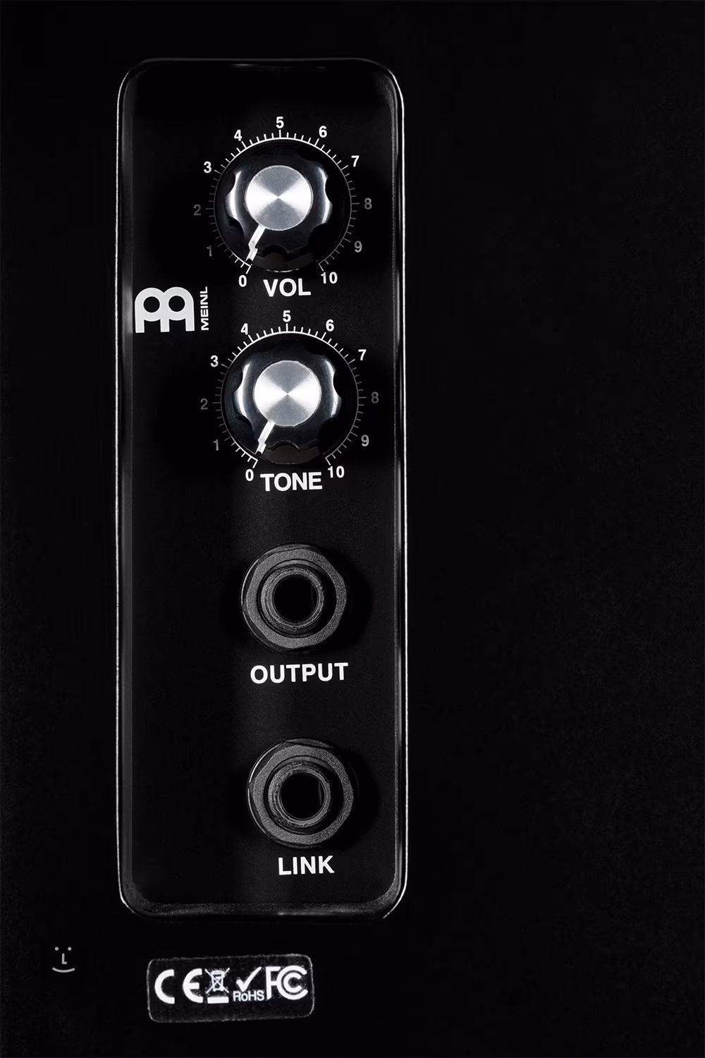 Dieses Modell verfügt außerdem über ein Trio passiver Piezo-Tonabnehmer - zwei für die Saiten und einen für die tieferen Töne. Wenn Ihnen die Lautstärke fehlt, schließen Sie ihn einfach an ein Mischpult, einen Aktivlautsprecher oder einen Combo an. Neben der hochwertigen Ausgangsbuchse befinden sich am Cajon Potentiometer zur Regelung von Lautstärke und Klangfarbe.
