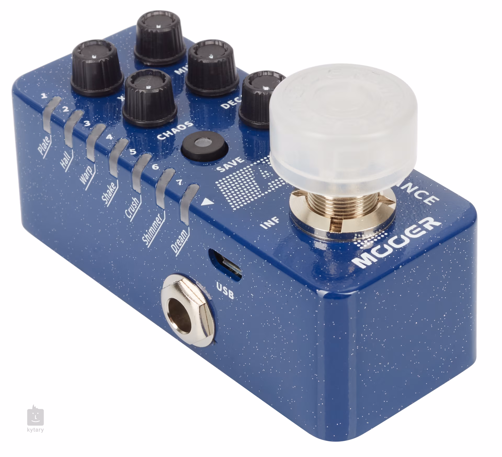 Mit dem Save-Regler, der auch zum Speichern von Presets dient, können Sie zwischen den Effekttypen wählen, während die Einstellungen der anderen Regler das Verhältnis zwischen trockenem und nassem Signal sowie die Form des Halleffekts bestimmen, d. h. EQ, Größe des virtuellen Raums oder Länge des Effektsounds. Trail On/Off ist sicherlich eine nützliche Funktion, mit der Sie festlegen, ob der Effekt nach dem Umgehen des Effekts nachhallt oder ob das Signal sofort abgeschnitten wird.