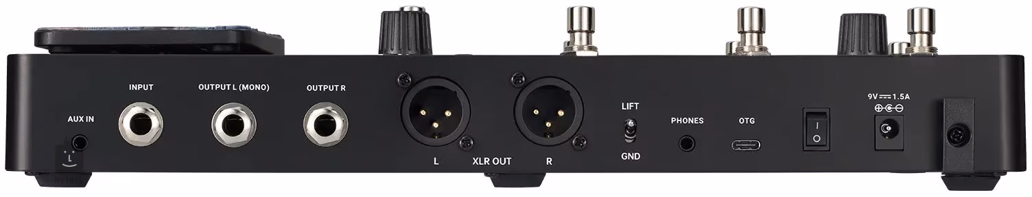 Auch das Design der Rückseite wurde überarbeitet und verfügt nun über einen Mono-Eingang, zwei Ausgänge (L/Mono, Stereo), zwei symmetrischen XLR-Ausgängen für den einfachen Anschluss an ein Mischpult, einem USB-Typ-C-Anschluss (OTG-Aufnahme, Bearbeitung von Effekten und Presets, Firmware-Upgrade), einem Kopfhörerausgang und einem Aux-In-Eingang für die Wiedergabe von Musik aus externen Quellen.