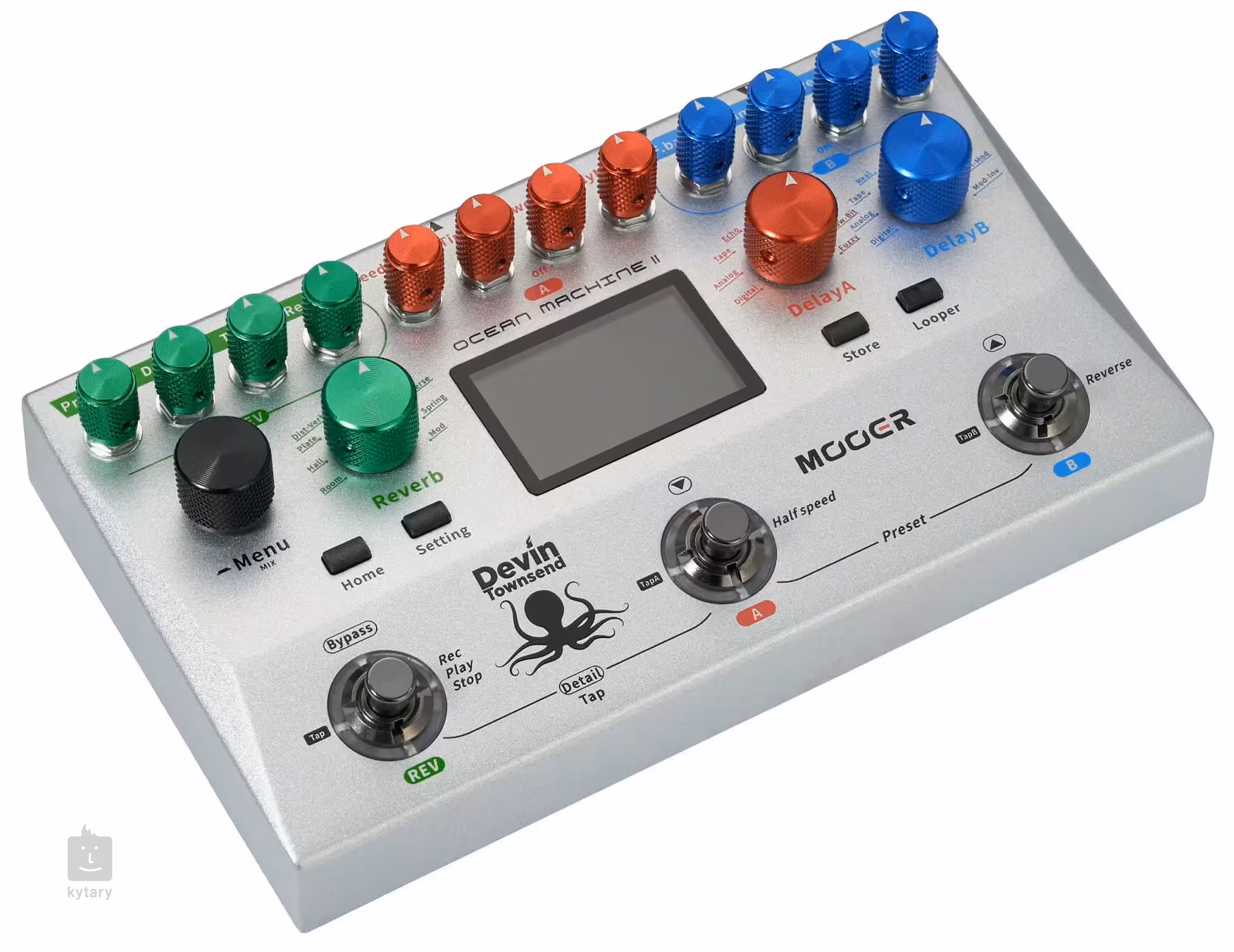 Mooer Ocean Machine II ist eine neue Version des Signature-Effekts des Progressive-Metal-Multi-Instrumentalisten Devin Townsend, mit dem sich mit drei unabhängigen Effektmodulen (Reverb, DelayA, DelayB) und Loop-Funktionen reichhaltige Ambient-Soundscapes erzeugen lassen. Im Vergleich zur Originalversion wurde der DSP-Prozessor für einen noch besseren Klang aktualisiert, die Looper-Aufnahmezeit auf 120 Sekunden verlängert und eine MIDI-Synchronisation hinzugefügt.