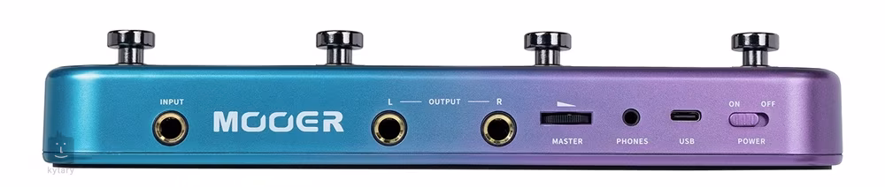 Auf der Rückseite befinden sich ein Mono-Eingang, ein Stereo-Ausgang, ein Master-Volume-Regler und ein Kopfhörerausgang. Der Multieffekt wird von einem Li-Ionen-Akku (2.000 mAh) mit einer Laufzeit von ca. 4,5 Stunden mit einer einzigen Ladung betrieben. Der Akku kann über den USB-C-Anschluss von einer Powerbank, einem Laptop oder einem Standard-USB-C-Ladegerät aufgeladen werden. Ein Multi-Effekt-Gehäuse und ein USB-A-auf-USB-C-Kabel sind im Lieferumfang enthalten.