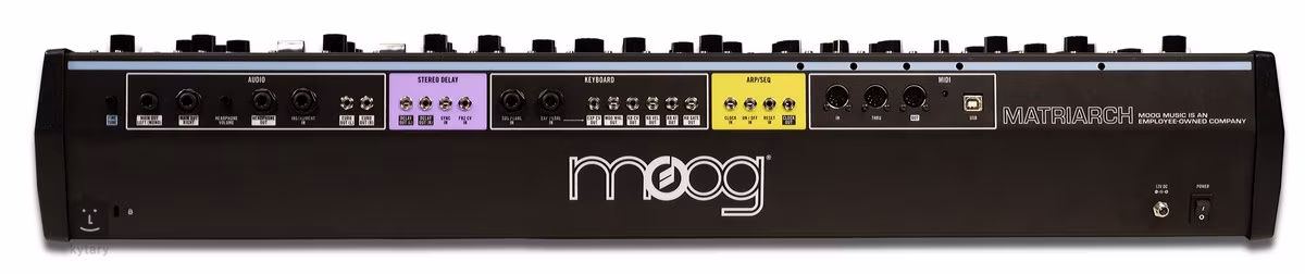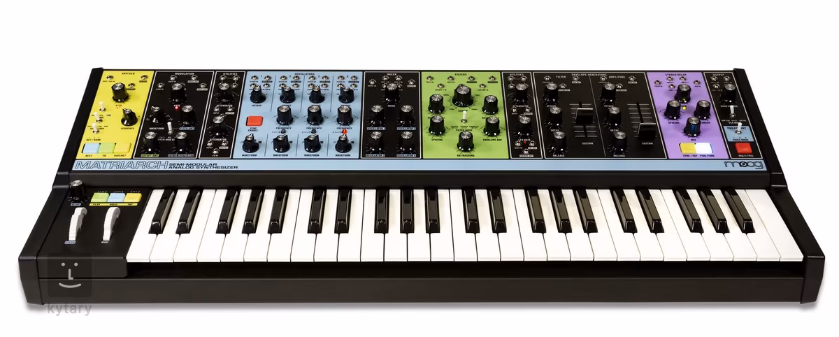 Matriarch ist das Flaggschiff der analogen semimodularen Synthesizer von Moog. Er bietet vier Stimmen im Paraphoniemodus, einen integrierten Sequenzer und Arpeggiator, Stereo-Ladder-Filter und ein Stereo-Analog-Delay. Der Synthesizer spielt auch ohne Kabelanschluss, aber das „Patching” über 90 Anschlüsse eröffnet völlig neue Möglichkeiten der komplexen Modulation und Synthese.