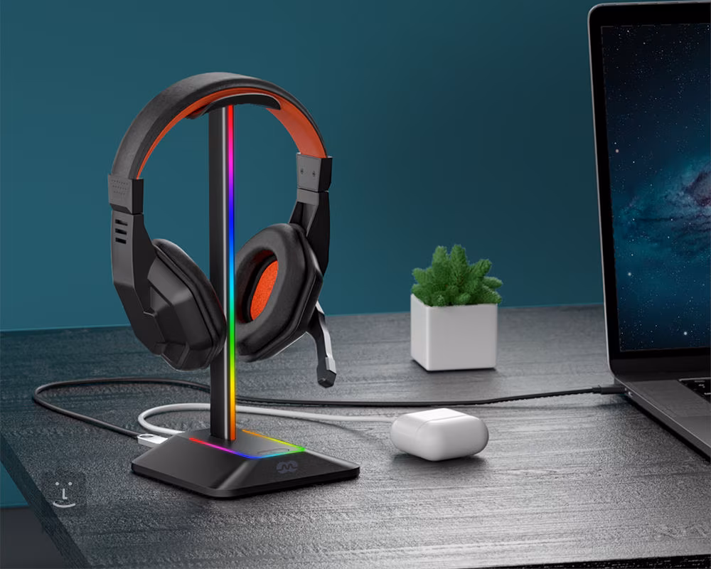 Kopfhörerhalterung mit LED-RGB-Hintergrundbeleuchtung und USB-C-Anschluss.