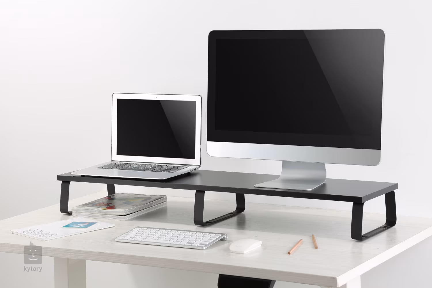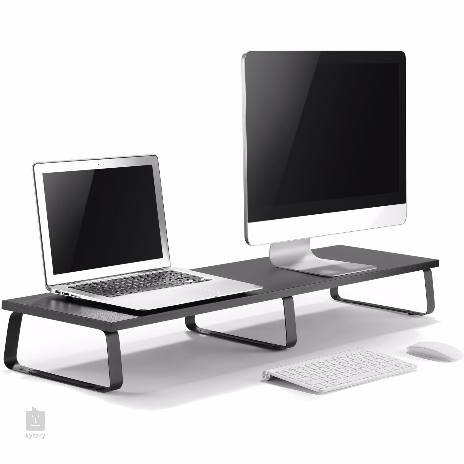 Eleganter Tisch für zwei Monitore (Laptop und Monitor), geeignet für Aufnahmestudio, Büro oder Arbeitszimmer. Der Tisch ist aus einer Kombination aus Holz und Stahl gefertigt und kann einen Monitor mit einer Diagonale von bis zu 32" aufnehmen.