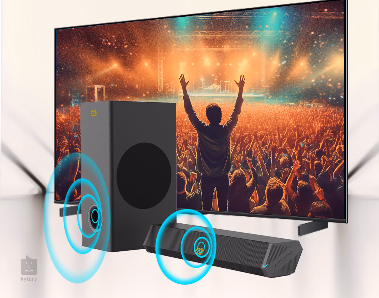Dank der vielen integrierten Anschlüsse, darunter HDMI-Arc, optische und analoge Anschlüsse, können Sie die Baugruppe an praktisch jedes Gerät anschließen. Mit dem eingebauten Bluetooth-Modul verwandeln Sie Ihr Handy oder Tablet ganz einfach in ein Heimkino. Der Subwoofer ist aus massivem MDF-Holz gefertigt, das zusammen mit dem 5-Zoll-Lautsprecher tiefe Bassfrequenzen liefert. Er ist über ein Kabel mit dem Centerpiece verbunden und kann an der Wand montiert werden.