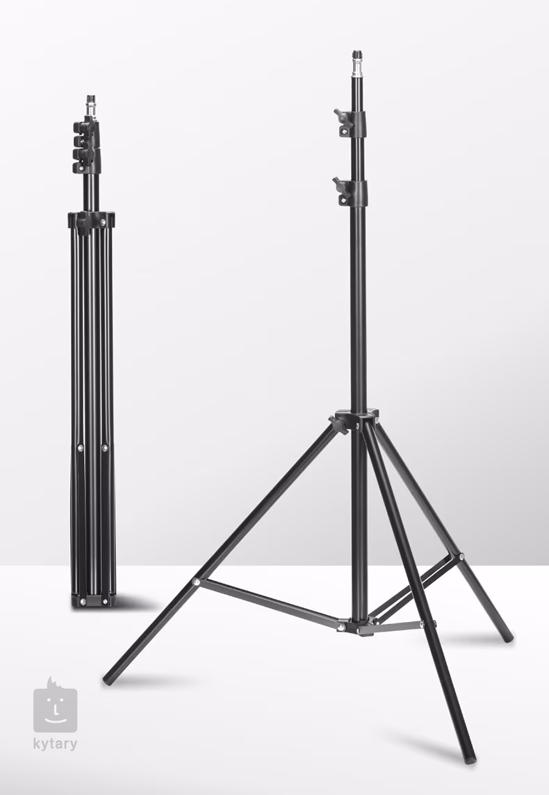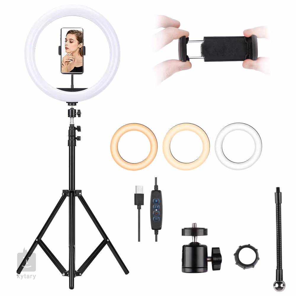 Im Lieferumfang ist eine universelle Handyhalterung enthalten, mit der Sie Podcasts oder Vlogs aufnehmen können. Ein höhenverstellbares Stativ mit einer Höhe von bis zu 220 cm ist ebenfalls erhältlich. Die Steuerung erfolgt über einen Vier-Tasten-Controller, der mit einem 2 m langen USB-Stromkabel verbunden ist.