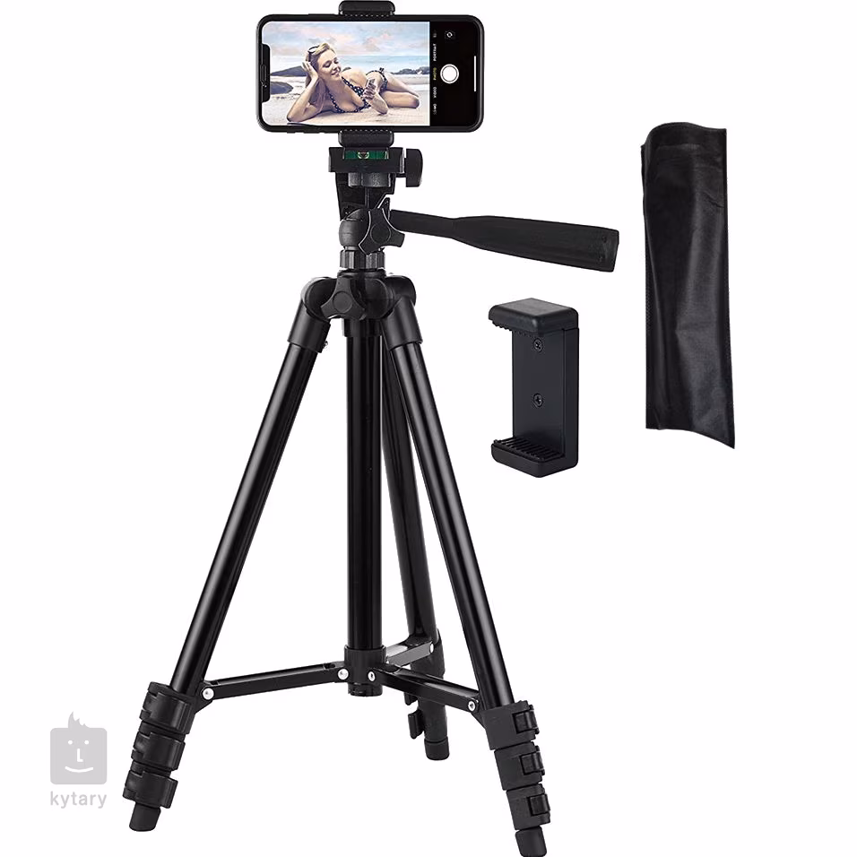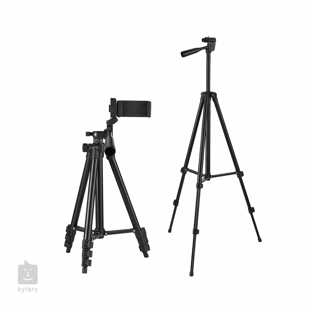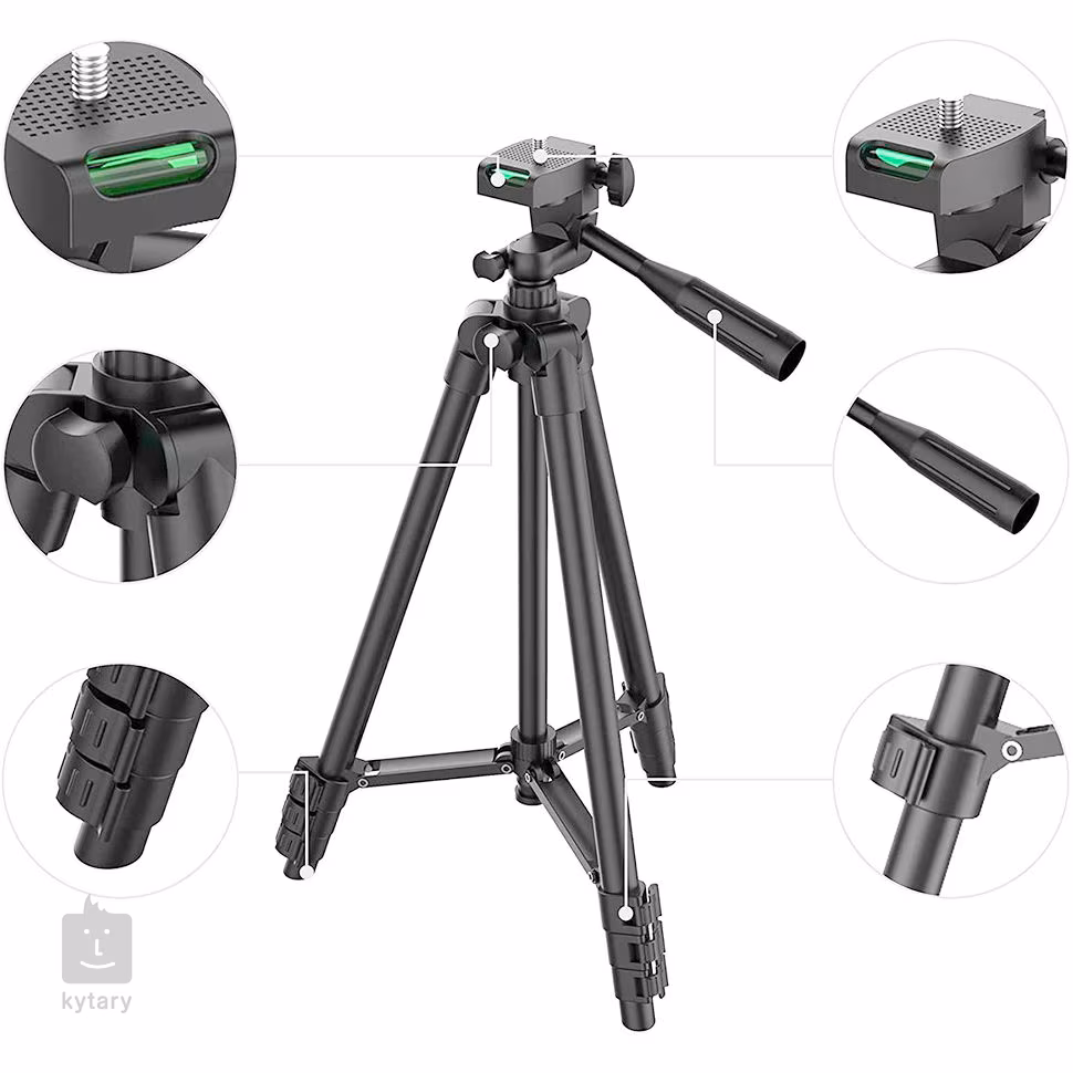 Ein professionelles Stativ für Smartphones und Kameras mit einstellbarer Höhe, hervorragenden Anti-Vibrations-Eigenschaften, einem stabilen Hebel für eine einfache Neigungseinstellung und einem faltbaren Design in kompakter Größe für einen einfachen Transport. Im Paket enthalten sind eine Smartphone- und Kamerahalterung sowie eine Tragetasche.