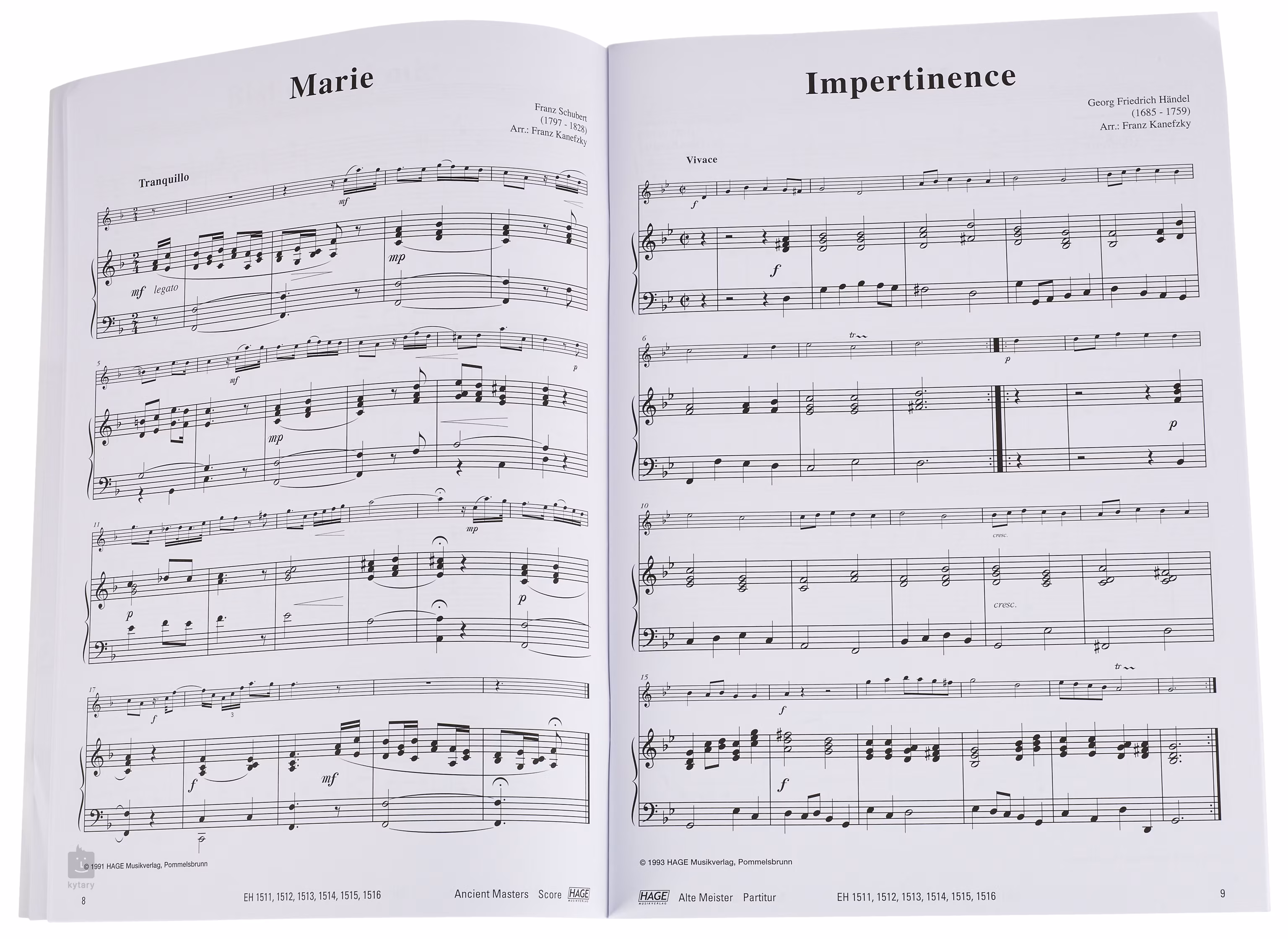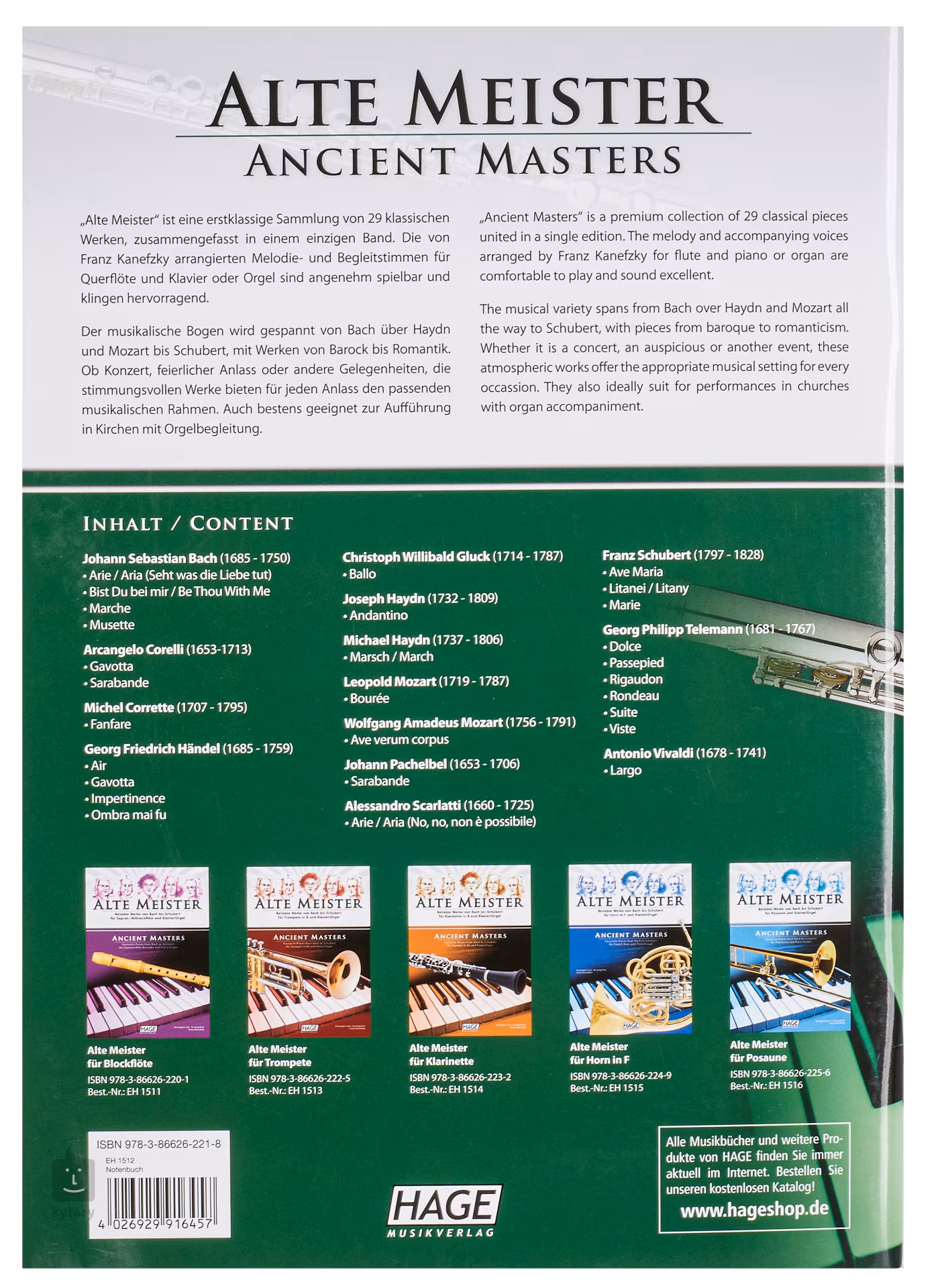 Ancient Masters enthält 29 bekannte Stücke der klassischen Musik (Barock, Klassik und Frühromantik) von Musikgrößen wie Bach, Haydn, Vivaldi, Mozart, Schubert und anderen in Bearbeitungen für Soloflöte mit Begleitung für Klavier/Orgel.