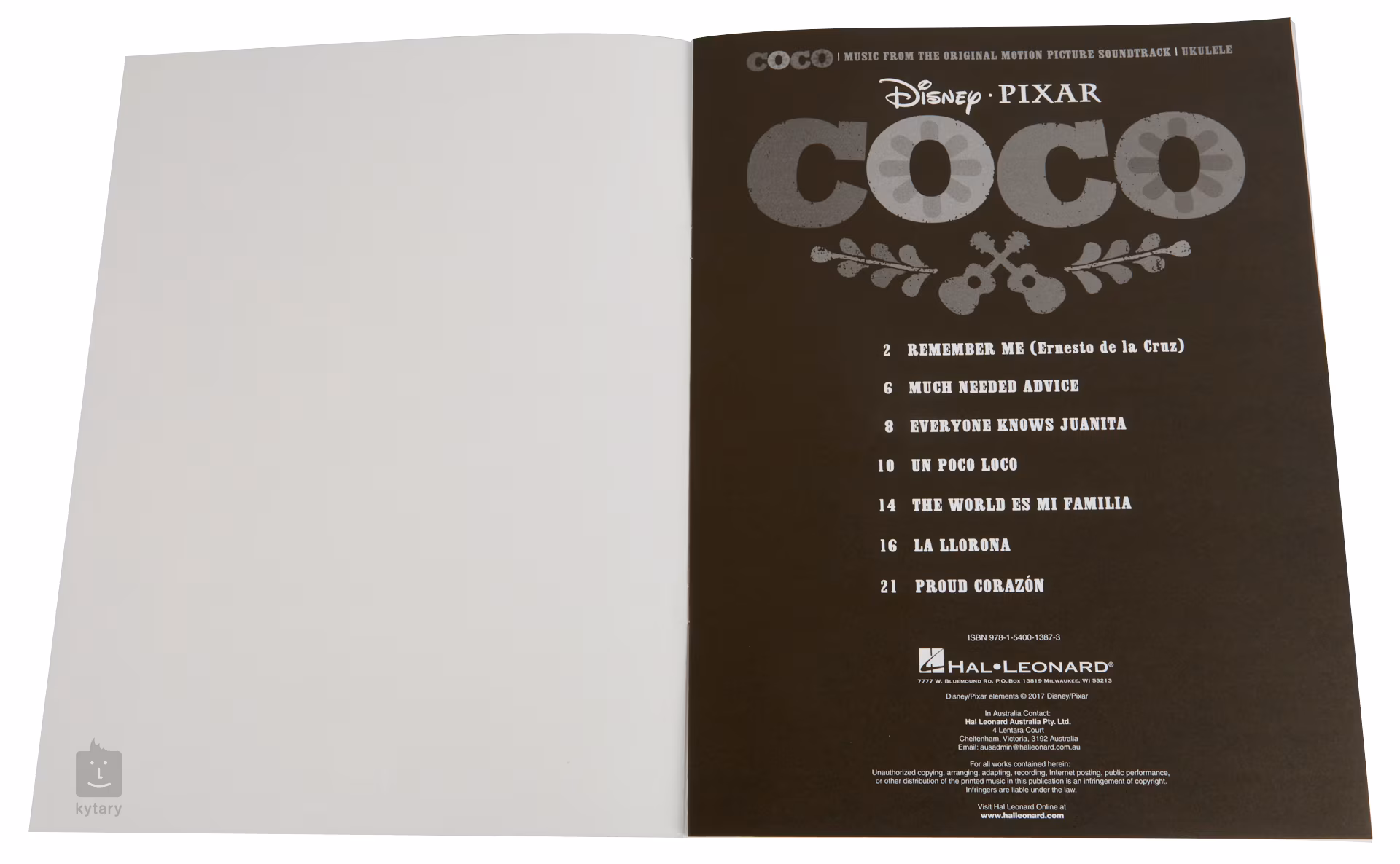 Diese Publikation bietet sieben Lieder aus dem 3D-Animationsfilm Coco, arrangiert für Ukulele. Die Noten enthalten eine melodische Gesangslinie, Texte und Diagramme mit Akkordbegleitung. Stimmung in G-C-E-A.