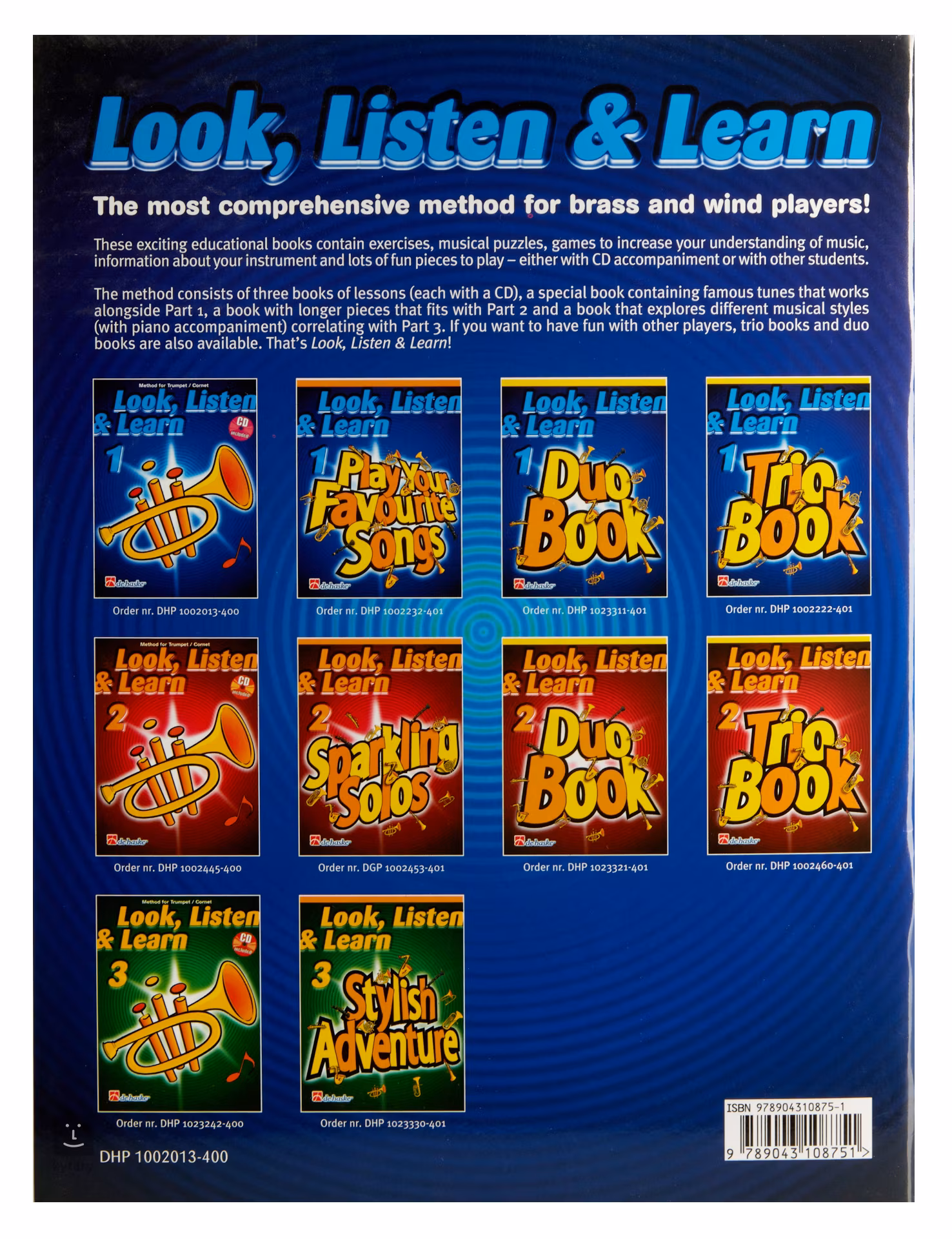 Die Trompeten-/Kornettschule Look, Listen & Learn 1 - Trompete/Kornett führt Sie durch die Grundlagen der Spieltechnik, Musiktheorie und die Geschichte des Instruments. Übungen, Tonleitern und kurze Stücke werden durch erfrischende musikalische Rätsel und Wortspiele ergänzt. Das Buch wird von einer Audio-CD mit Unterrichtsaufnahmen begleitet.