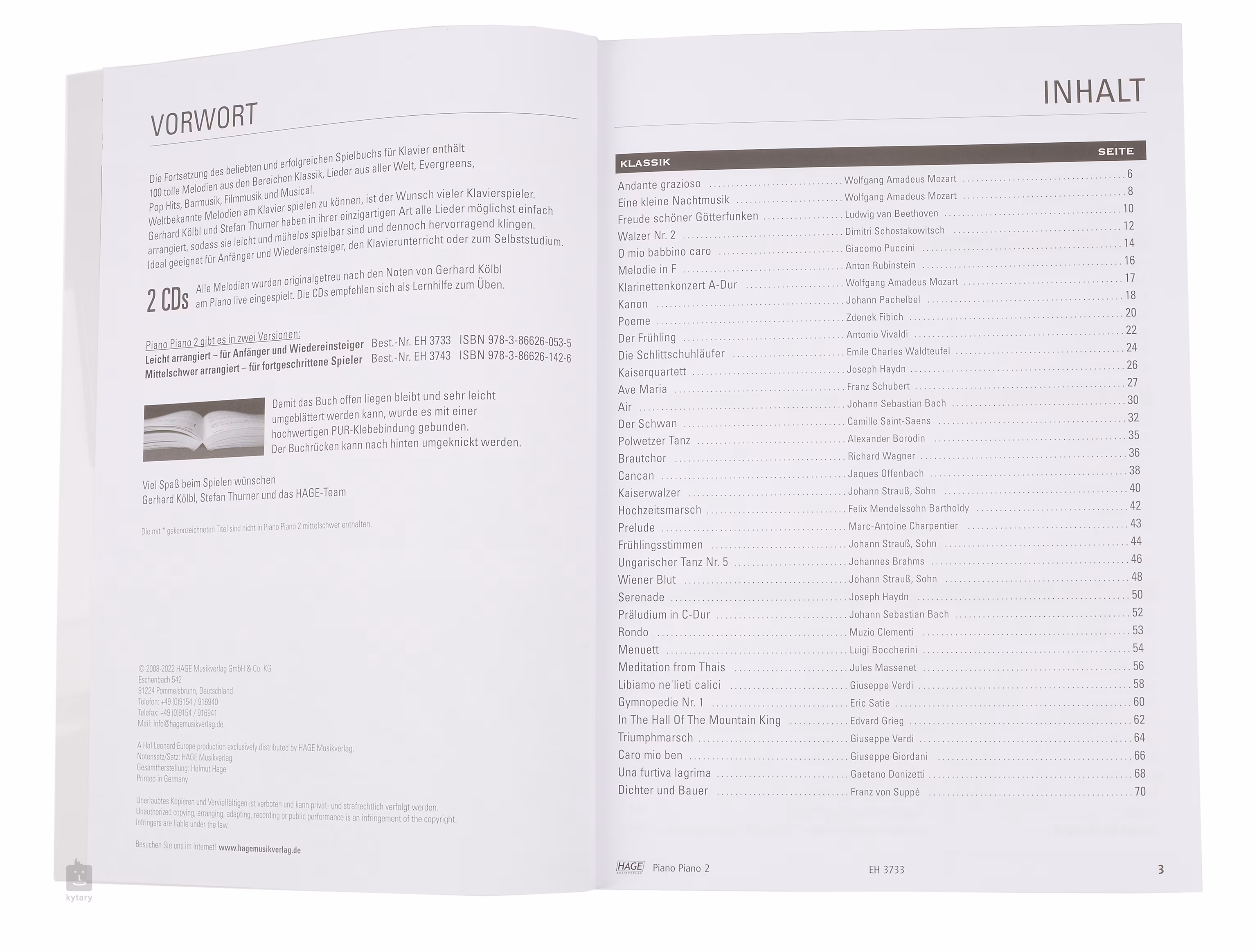 Piano Piano 2 easy bietet 100 bekannte Melodien aus der klassischen und populären Musik in einfachen Arrangements für Klavier. Die Publikation enthält auch zwei Audio-CDs mit den Aufnahmen der Stücke.